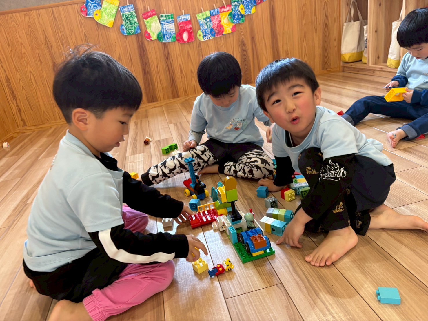 クリスマスの日は天気が悪いみたいだよ〜という話から、「サンタさんのソリはどうなるのかな?🤔」と問いかけると、「傘をさすんじゃない?☂️」「車みたいなソリになるかも!🚗🎁」など、子どもたちの可愛らしい想像がどんどん広がり、笑顔あふれる楽しい朝の会となりました☺️💕その後は室内で、ブロック遊びやままごと遊びを楽しみました🧱🍳