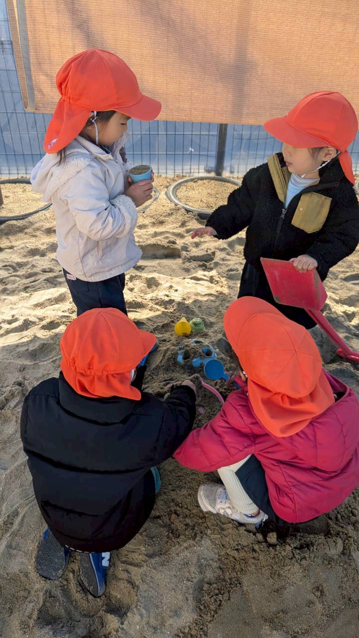 製作の後は園庭にいきました。お日様が当たる芝生に大の字になっては『気持ちいいねー😊』とはしゃいだり、砂場でアイス屋さんごっこをしたりと色々な遊びを楽しんでいたぱんだ組さんでした👏。