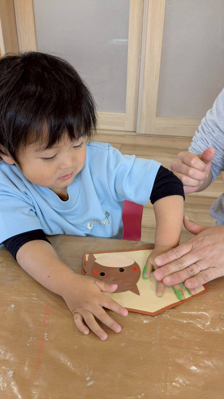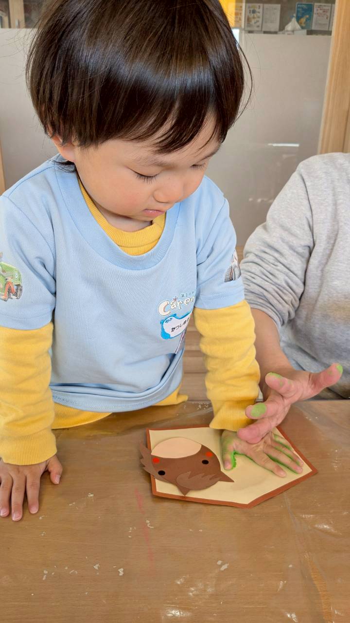 その後はウマ🐴に糊をつけて絵馬の貼りつけていき、手形取りもして門松🎍を作っていきました。今年の可愛い干支の絵馬ができました🤭。