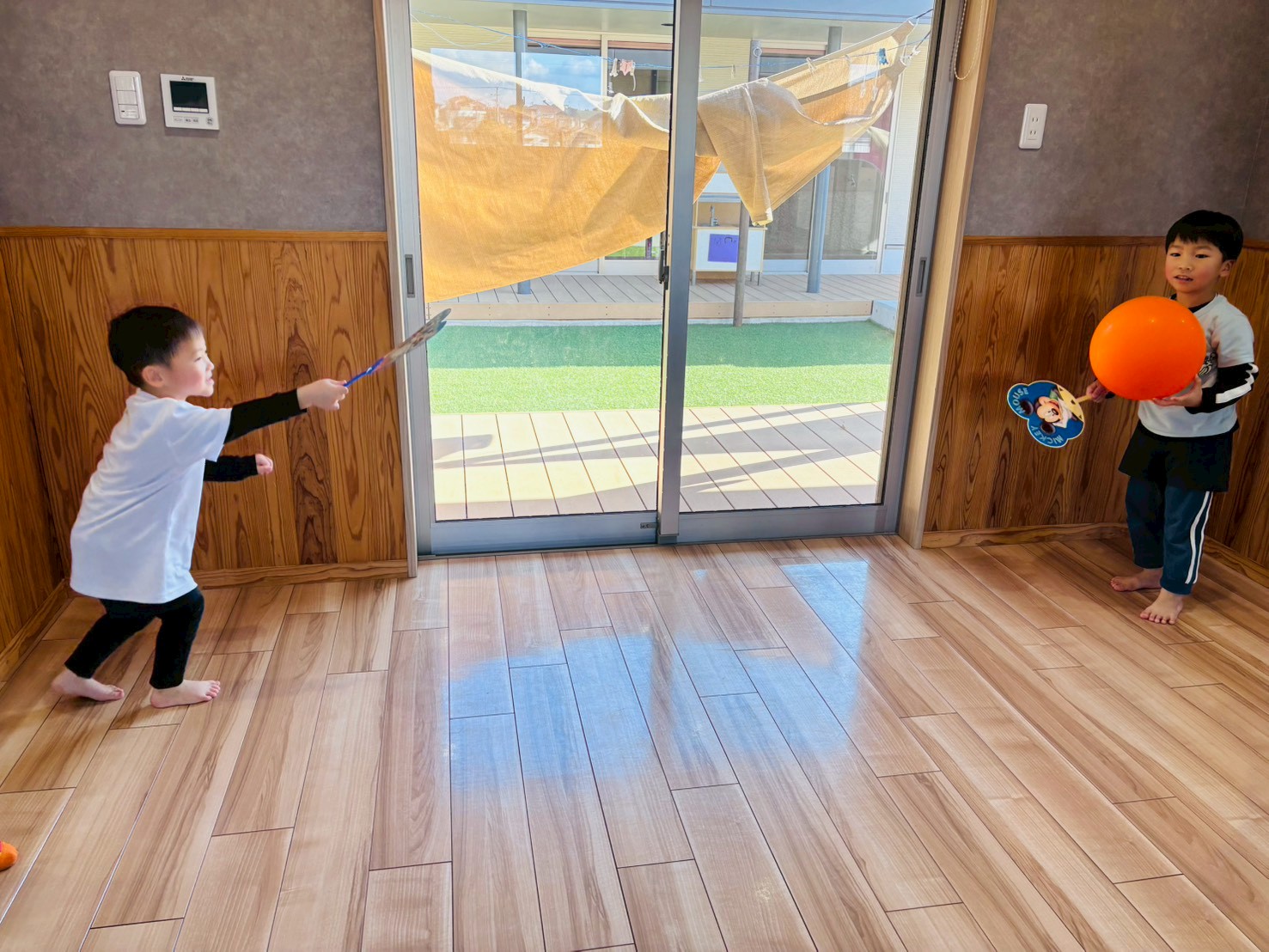 羽子板遊びは、うちわと風船を使って行いました。異年齢でペアを組み、力を合わせて風船を打ち合う姿が見られました。2回目はうちわを使わず、手で風船を飛ばすことに挑戦。保育者と協力しながら、10回以上続けて風船を飛ばすことができ、達成感を味わうことができました✨
