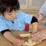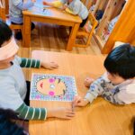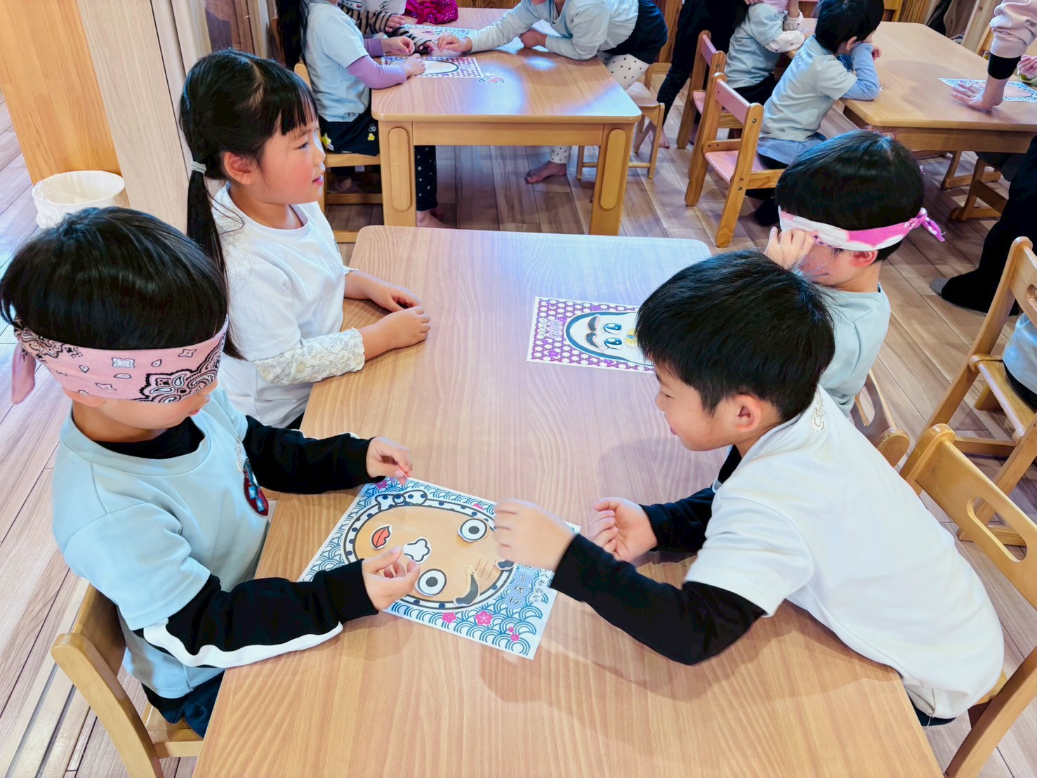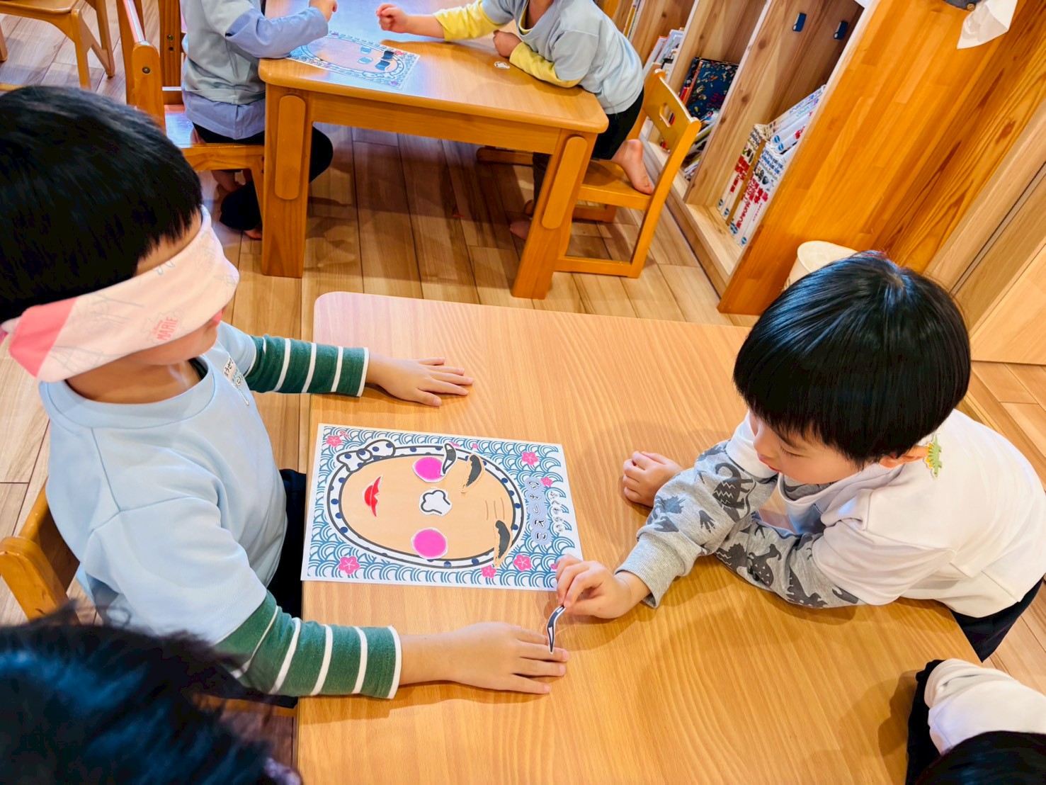 福笑いでは、目隠しをした園児が周りの友だちの声かけを頼りに、顔のパーツを置いていきました。「もう少し上だよ!」「右だよ!」といった声が飛び交い、出来上がった顔を見てみんなで大笑い😊 終始、楽しそうな雰囲気に包まれていました。