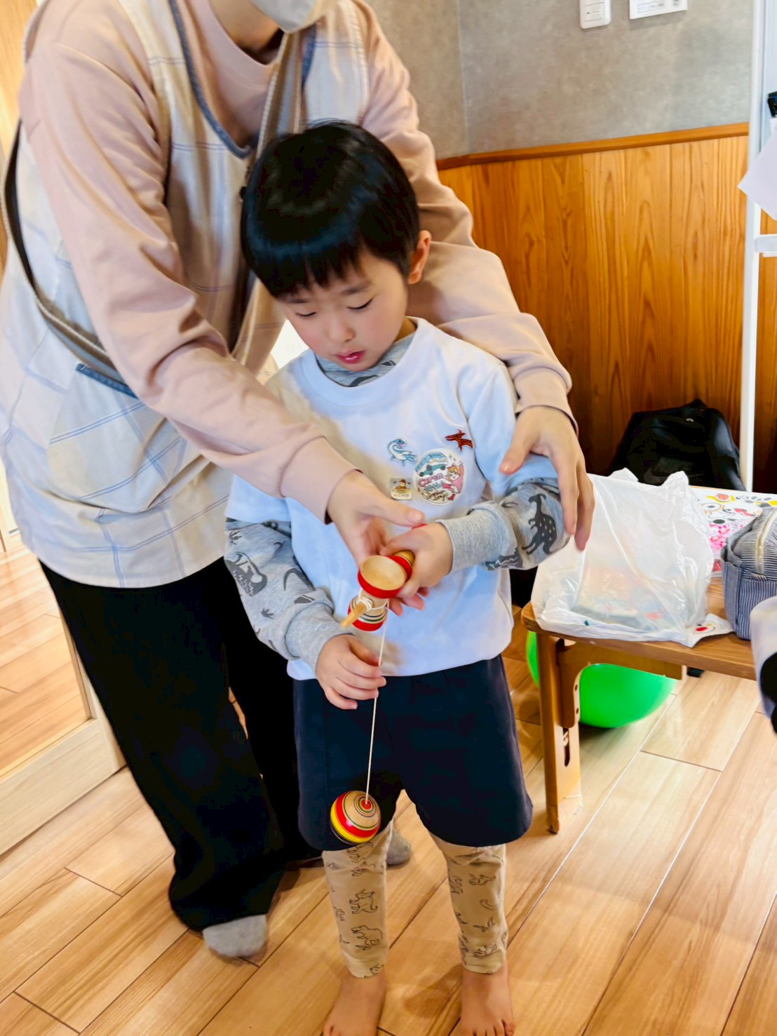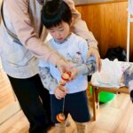 まずは、けん玉に挑戦しました。持ち方から一つひとつ伝えていくと、「どうしたら玉がけん先に入るのかな?」と考えながら取り組む姿が見られました。最初は勢いよく玉を回してしまう園児も多く、試行錯誤しながら挑戦していましたよ。