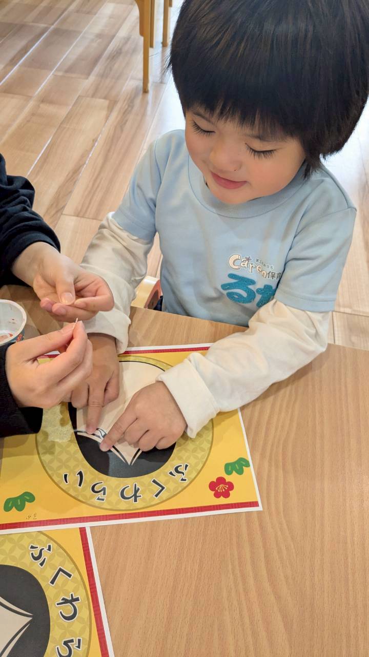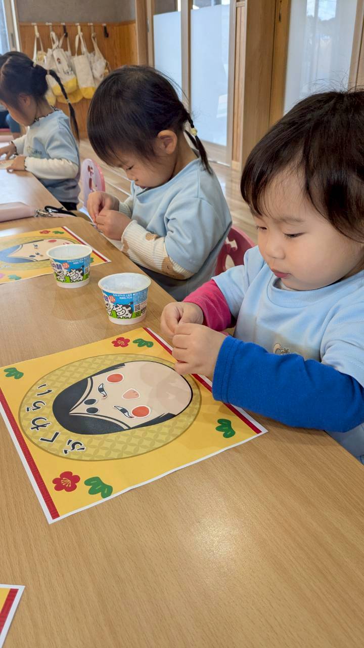 今日はお正月遊びの一つ、福笑い遊びをしました。おかめさんの顔に両面テープを剥がして一つ一つのパーツを貼っていきました。一人一人個性豊かな面白い福笑いに仕上がりましたよ😆 出来た福笑いを壁に貼ると『あれ私のだよ、これ僕のだよ』とお話ししあっている可愛い姿も見られました🩷。