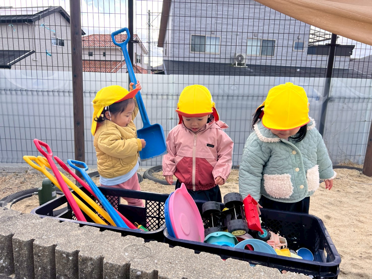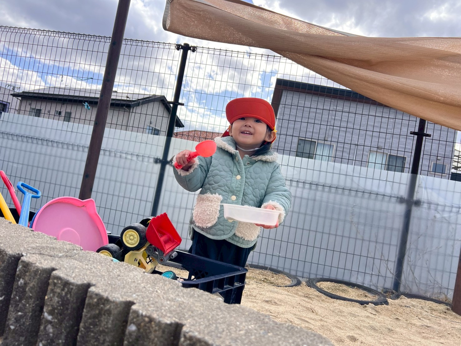 その後はさくらんぼリズムで体をたくさん動かし、園庭へ🎶寒さに負けず元気いっぱい!砂場に一直線で、大きなスコップを使ったり、アイス屋さんになってたくさん作ったりと夢中になって遊んでいました🍦