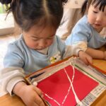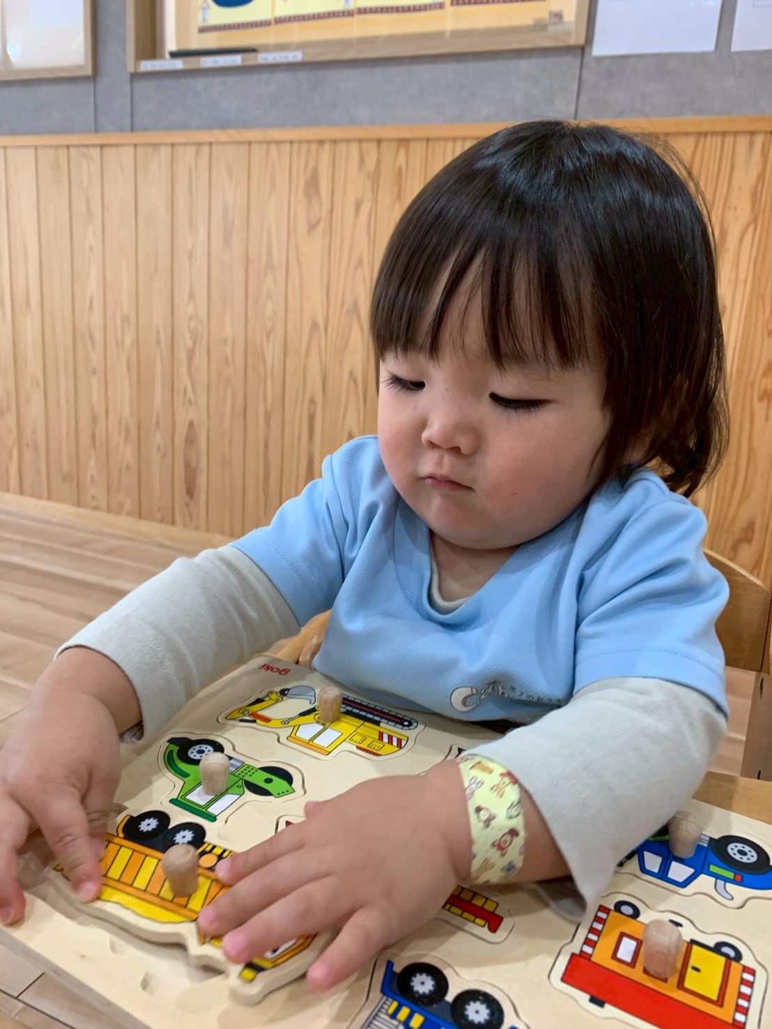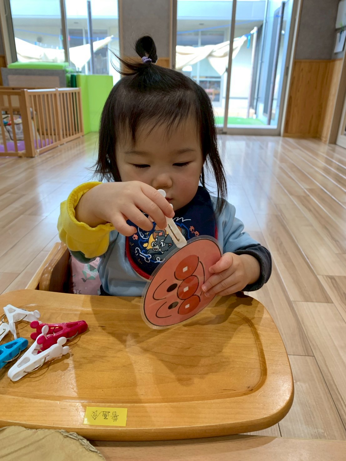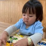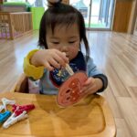 今日は机上遊びや指先遊びをしましたよ😊動物や乗り物などの型はめパズルを自分で選んで始めました❣️形に合わせるのは難しそうでしたが、色や模様、形を楽しんでいました😄洗濯バサミを使った指先遊びでは指先でつまむことができても挟む事が難しそうでしたが、先生と一緒に何度か繰り返し挟めるようになったお友だちもいましたよ😃とっても集中して遊んでいました💕