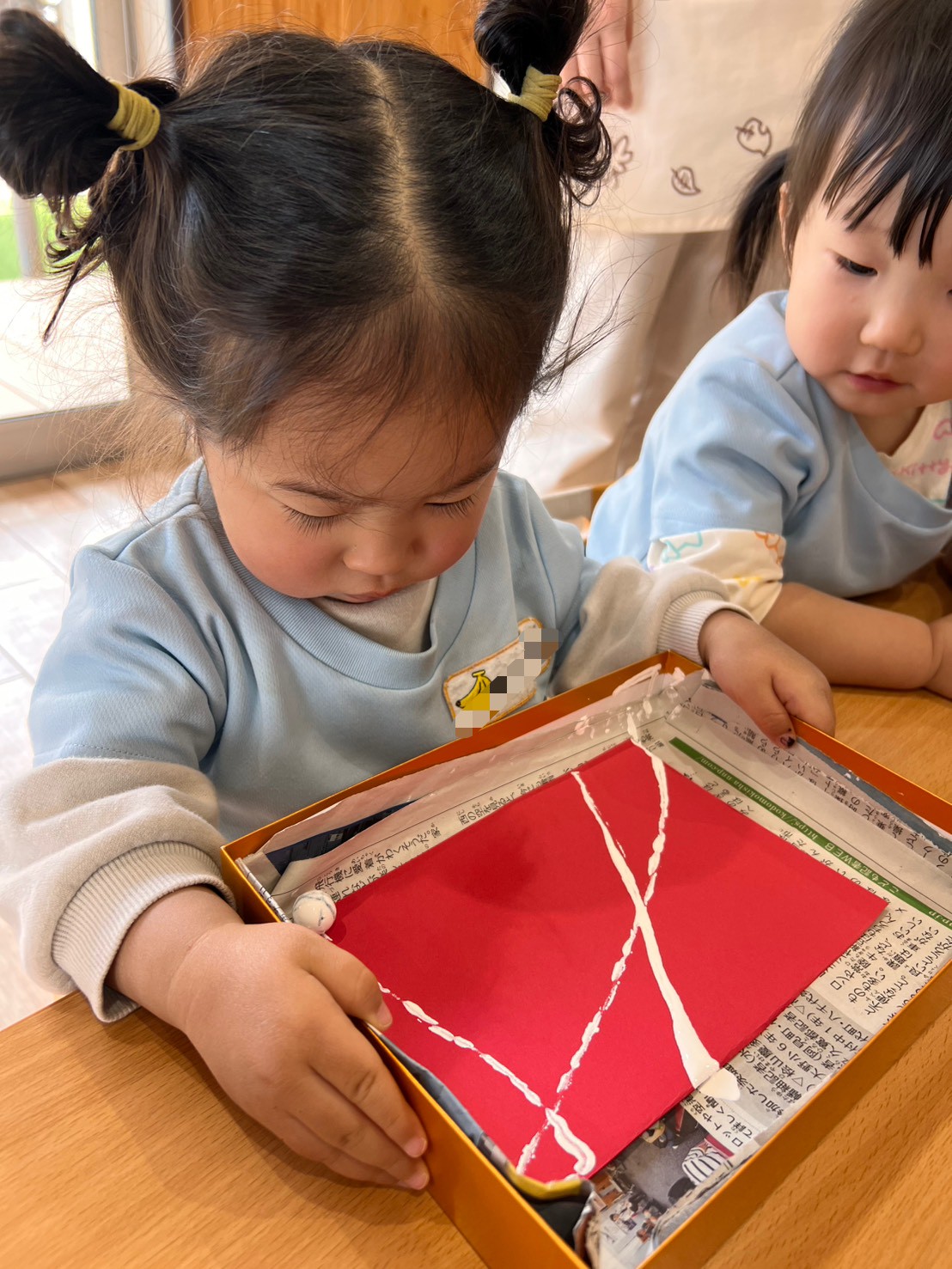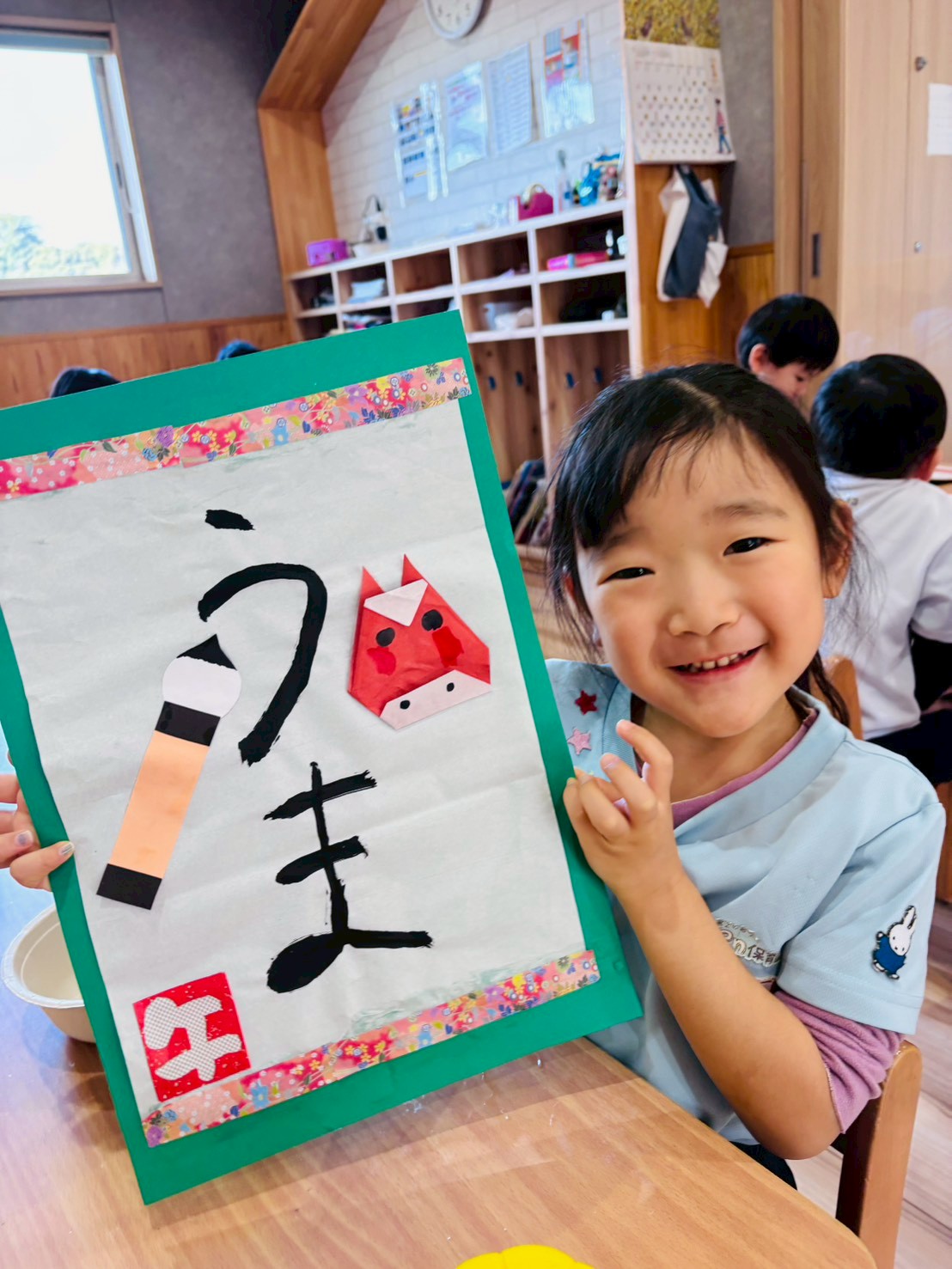 待ってる間に、月製作の続きをしましたよ💓昨日作った馬や筆、書き初めをのりで貼りました☺️🎶