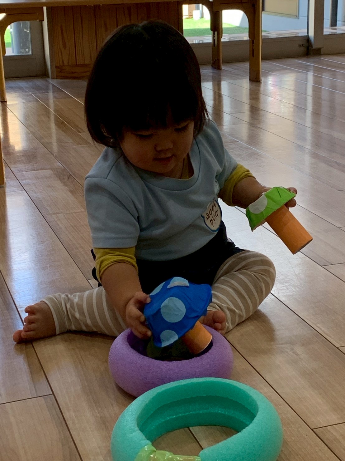 発表会で使ったきのこ🍄や手提げバック、ウレタンの輪っかなど色々な物をそれぞれの遊び方を見つけて遊び、お友だちの遊び方を真似して楽しんでいるお友だちもいましたよ😄✨