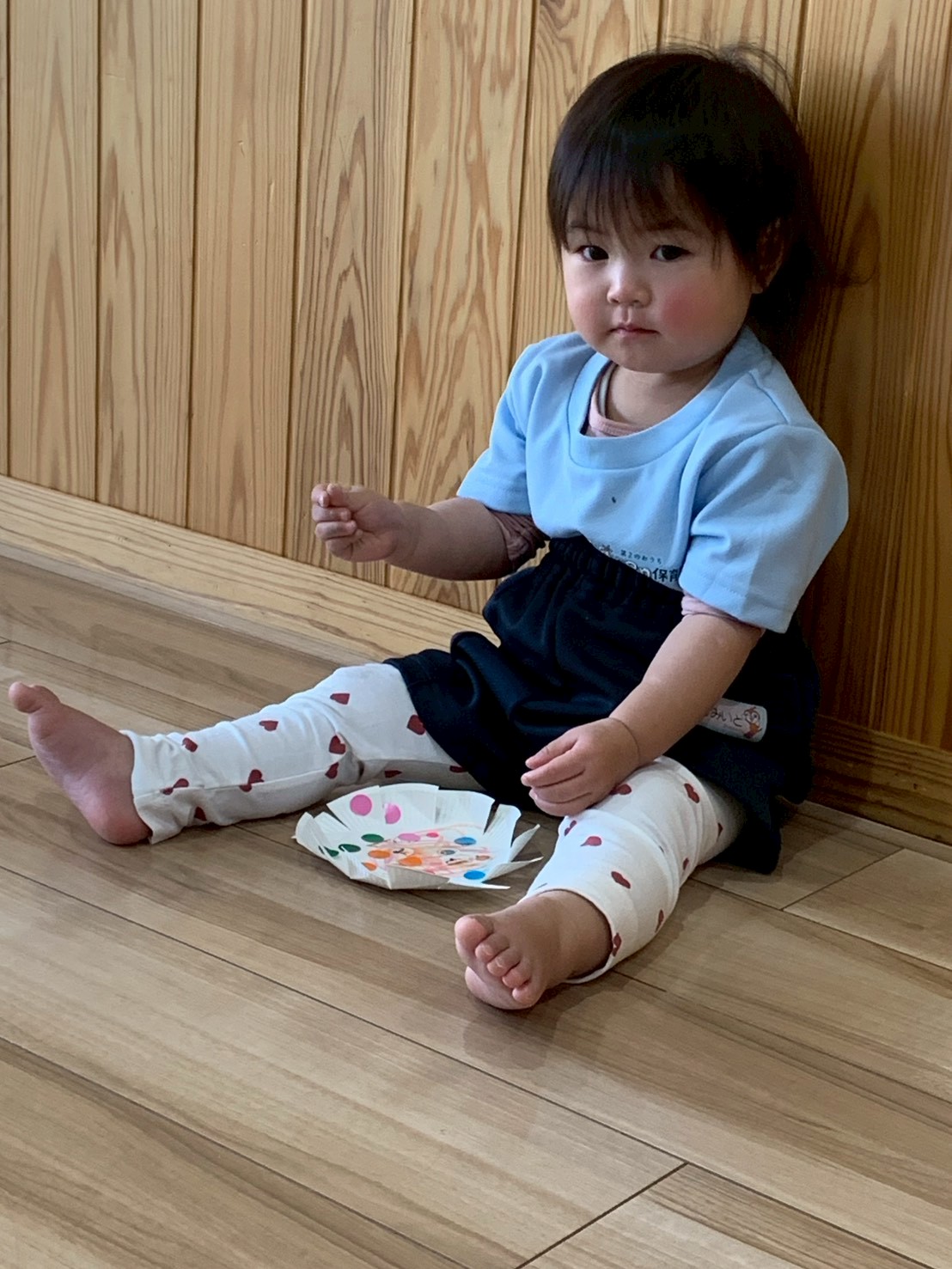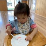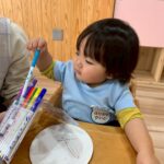 今日は紙皿でコマを作りました😊水性ペンの好きな色を自分で選んでキャップを外してなぐり描きを楽しんでいました❣️ペンの色を1本ずつ交換しながら、描いていましたよ😃それからシールを貼って飾り、先生の手を借りる事なく、“自分で”できるようになっています💕完成したコマを床で回してみましたが、力の加減が難しかったようです😅