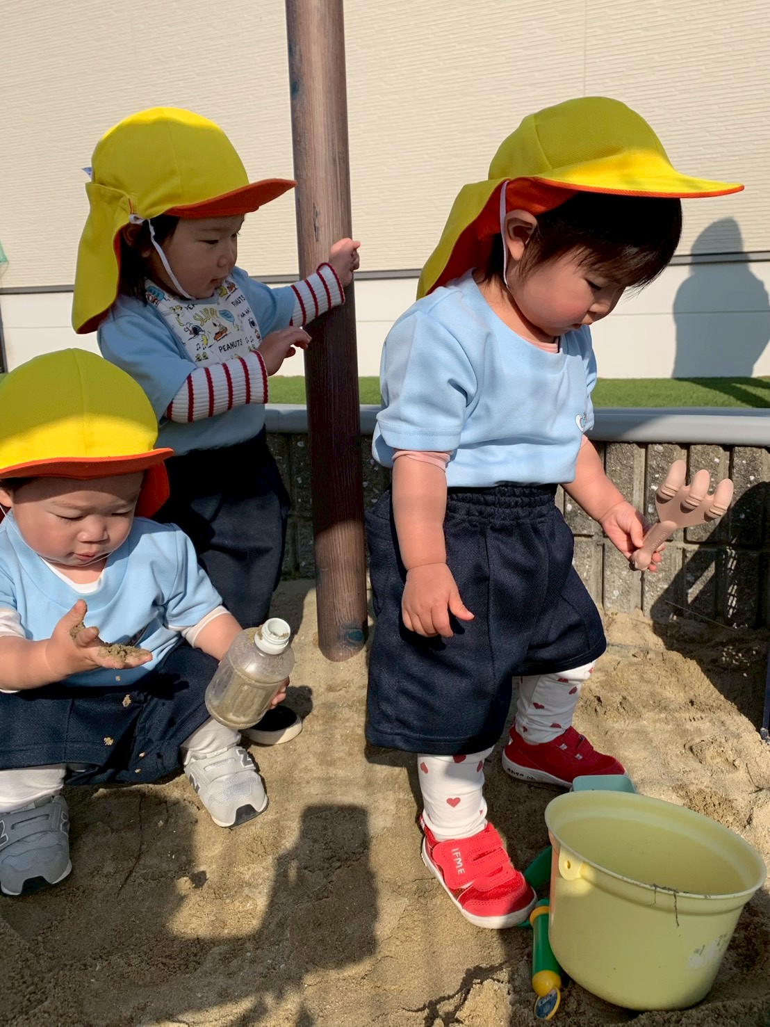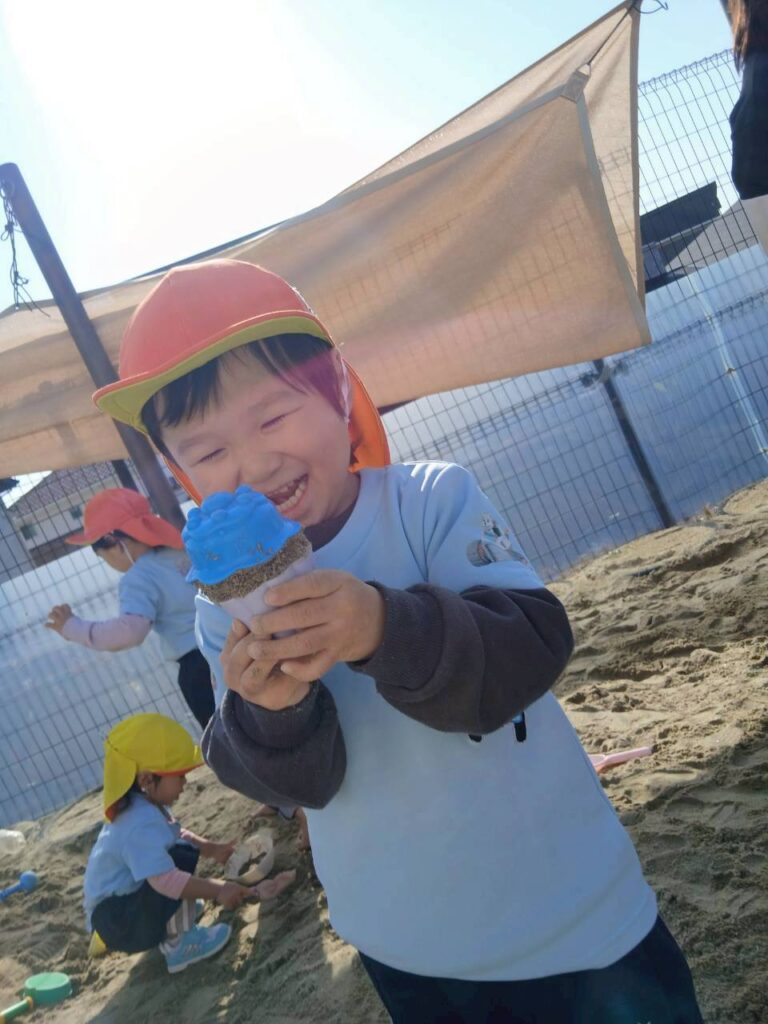 その後は園庭のお砂場で砂遊びをしましたよ❣️暖かくて気持ちの良いお天気で、お友だちもウキウキ💕お砂場ででスコップで穴を掘ったり、バケツやカップに入れたり、先生が作ったカップのプリン形🍮に「おーっ!」と驚きの歓声をあげるお友だちもいましたよ😆ぱんだ組さんやりす組さんが一緒に遊んでくれましたよ✨久しぶりのお砂場遊びでたくさんの笑顔が見られました🥰