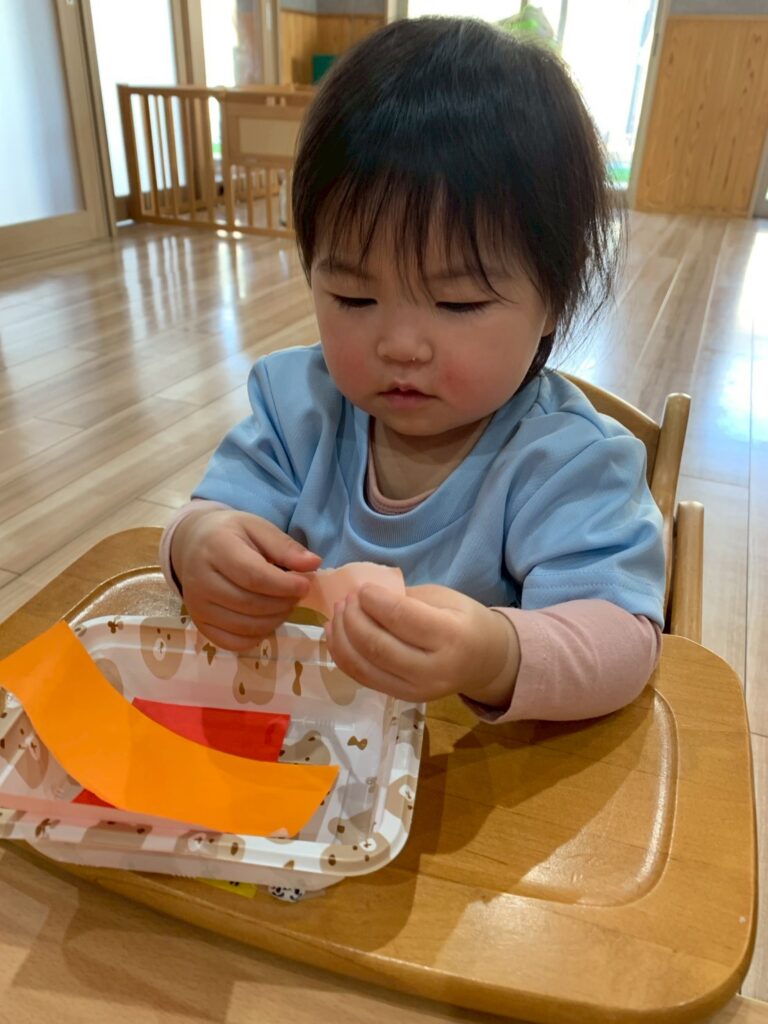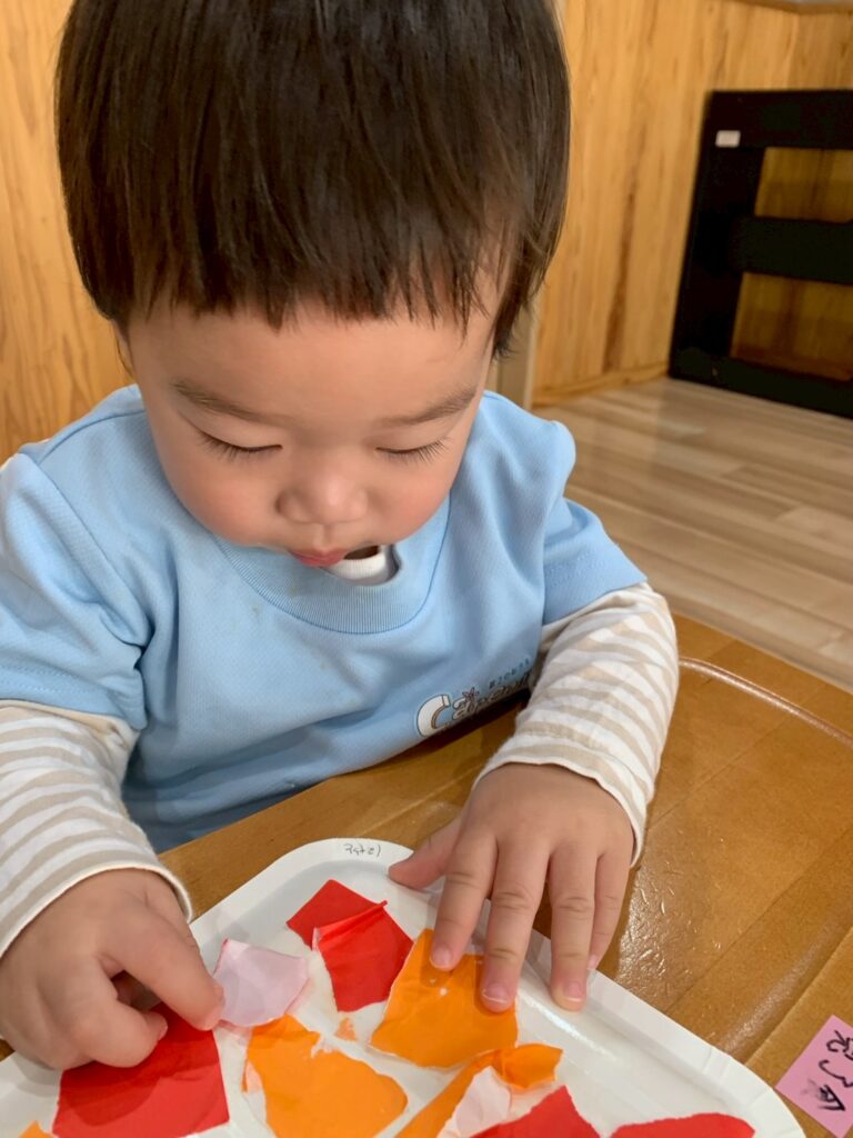 今日は色紙をちぎって紙皿に貼って、羽子板作りをしましたよ😊細かくちぎるのはまだ難しいですが、両手で色紙を引っ張ってビリビリと音を楽しみながらちぎっていました❣️紙皿の両面テープにちぎった色紙をペタペタと貼っていきましたが、手もくっついてしまう感触が楽しかったようです😃完成したら羽根つき遊びをしたいと思います😊