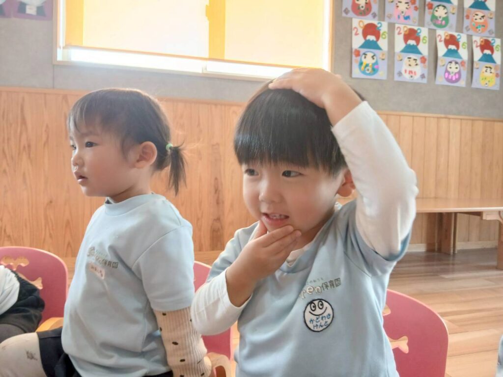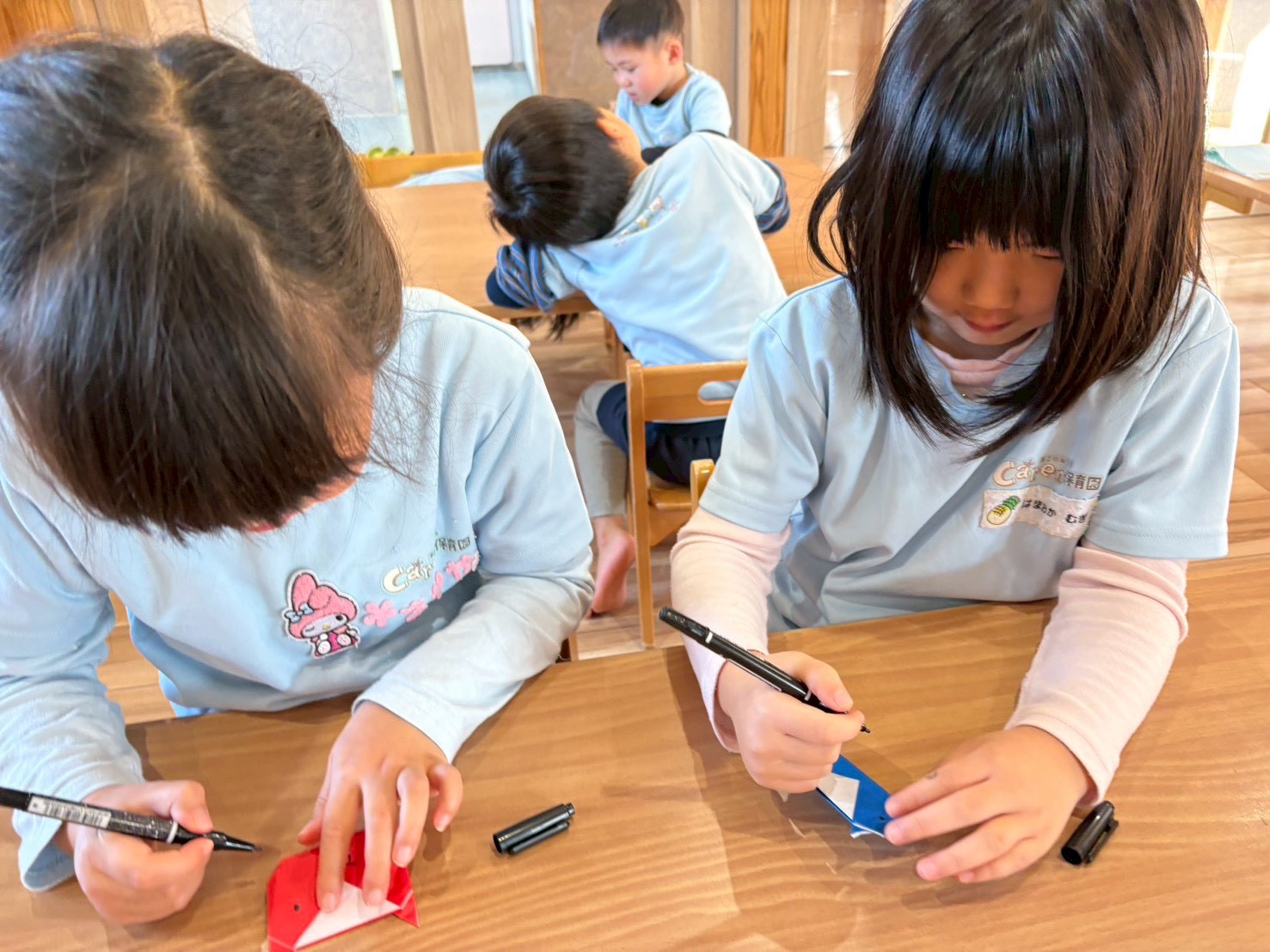 待ち時間には、鬼やだるまを折り紙で折って過ごしました。年長児が年少児に優しく折り方を教える姿もあり、異年齢での関わりが温かく感じられましたよ♡