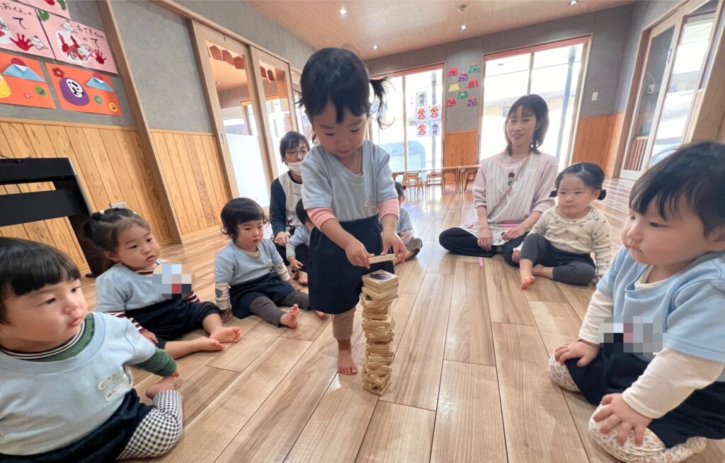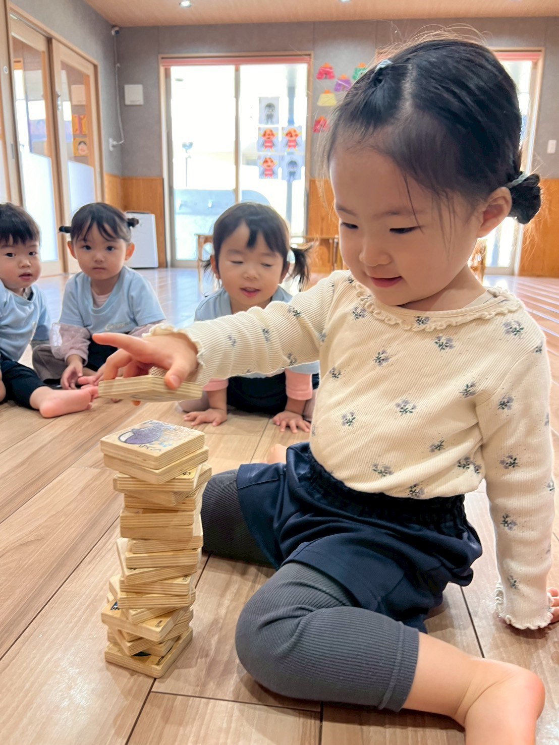 積み木を順番に重ねていくゲームでは、「次はだれかな?」と順番を意識しながら、みんなで高く積み上げることを楽しんでいましたよ✨