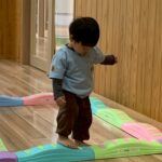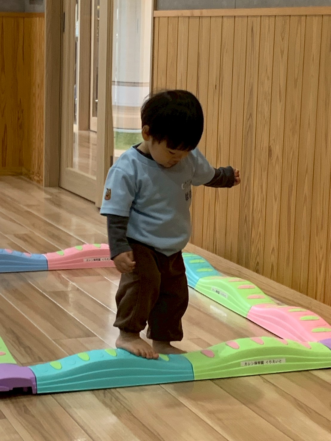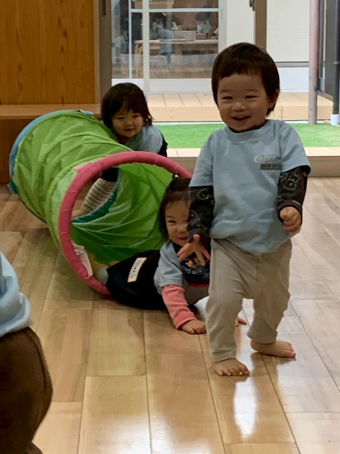 その後はお部屋の中でサーキット遊びをしました😊トンネルや平均台、ボブルスで身体を動かして遊びました💕平均台に乗る時にお友だちと顔を見合わせて一緒に乗って楽しんだり、お友だちの名前を呼んでトンネルに連れて行って一緒に遊んだりと、お友だちとの関わりが増えてきて、とっても仲良しで可愛いひよこ組のお友だちでしたよ🥰