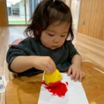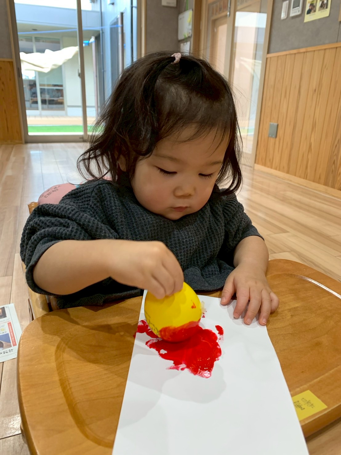 今日は季節の製作をしましたよ😄ちょっと遅いですが、富士山と初日の出🗻☀️を手形で製作しました❣️いつもの手形は手のひらに一色の絵の具ですが、今日は2色の絵の具を塗ると、不思議そうに先生の顔を覗き込んでいましたよ😄また、小さい風船で画用紙全体にペタペタとスタンプをしてみました😊手に持った風船がスタンプするたびに跳ね返ってくる感触が楽しかったようで「ぽんぽん」と言いながらスタンプしていましたよ🎈