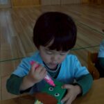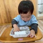 真っ白な粘土に始めは恐る恐る触っていましたが、ちぎってみたり、指で穴を開けて遊び始めましたよ💕