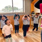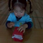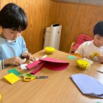 英語教室の後は節分の豆入れの福の神作りをしました。福の神にペンで目👀と口👄を書いて糊をつけて貼り付けました。 可愛い鬼と福の神の豆入れが出来上がり、もう豆まきの準備万端なぱんだ組さんです🤭。