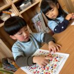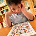 待っているクラスはプリント学習で、たくさんの絵の中から同じ絵を数えて個数を書きました✏️うさぎ組は数を書く代わりにシールを貼りました🔴🔵こあらきりん組は丸をつけながら数を出すことができました○頑張った分、答え合わせをして当たるといつも以上に「やったー!✨」と喜んでいました🤭💕