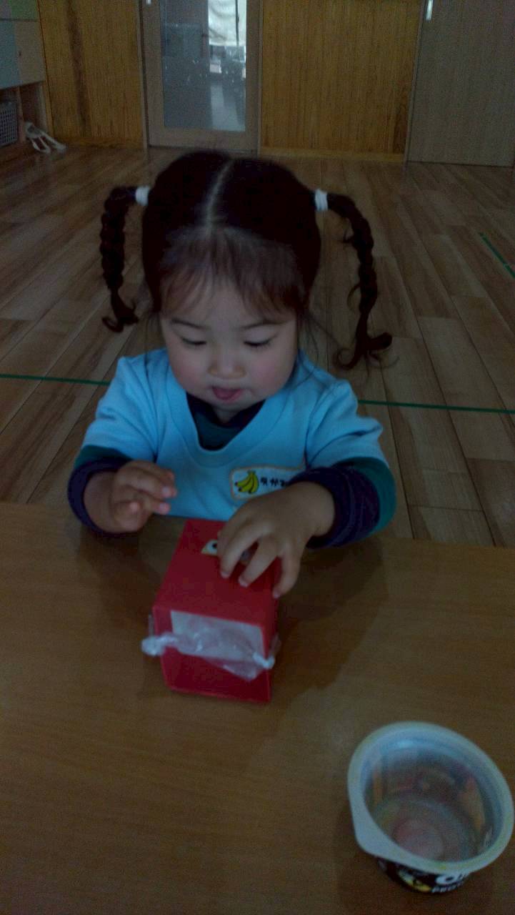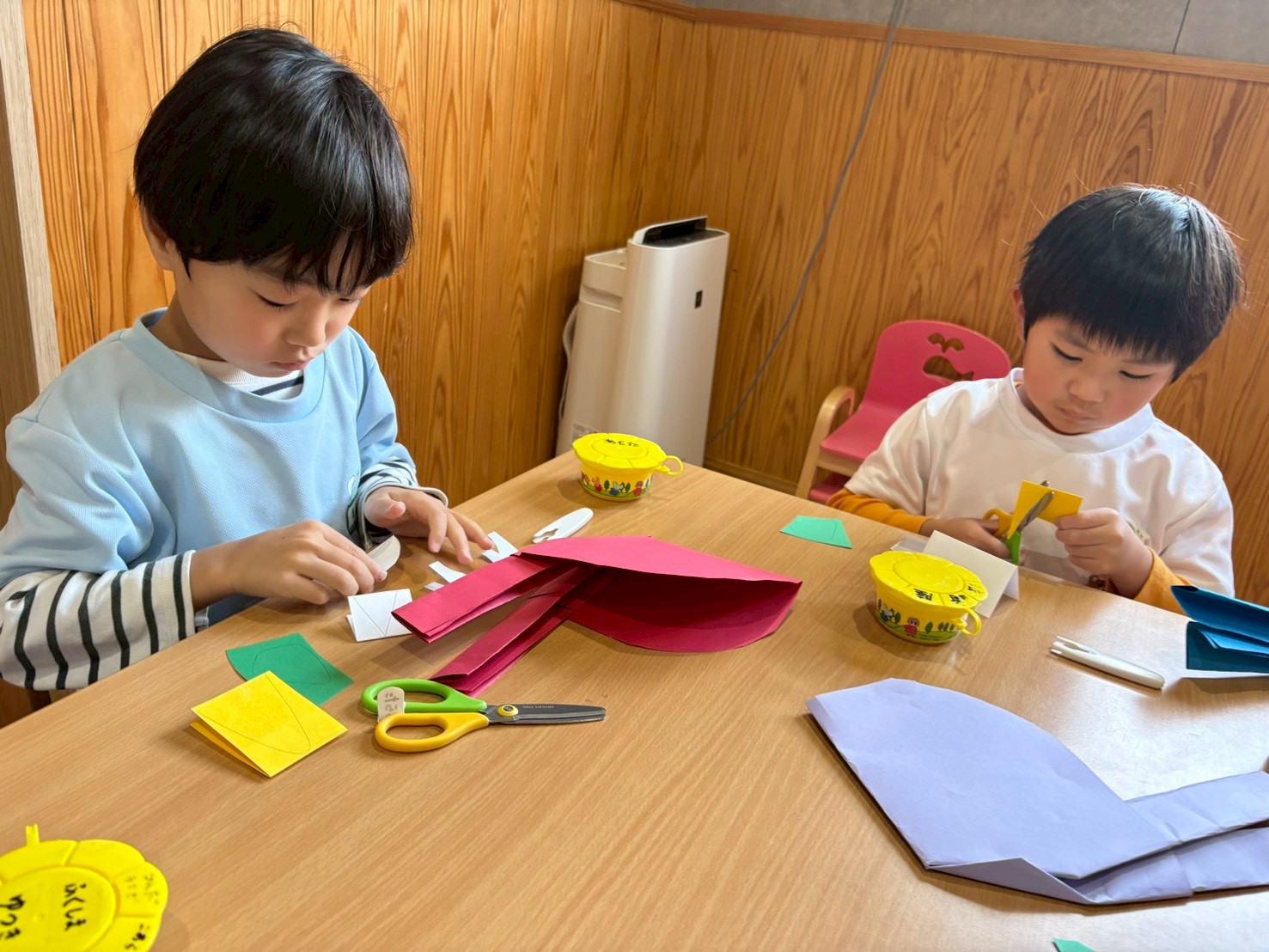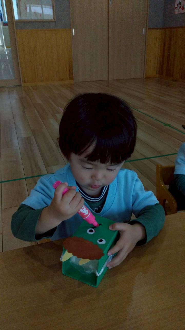 英語教室の後は節分の豆入れの福の神作りをしました。福の神にペンで目👀と口👄を書いて糊をつけて貼り付けました。 可愛い鬼と福の神の豆入れが出来上がり、もう豆まきの準備万端なぱんだ組さんです🤭。
