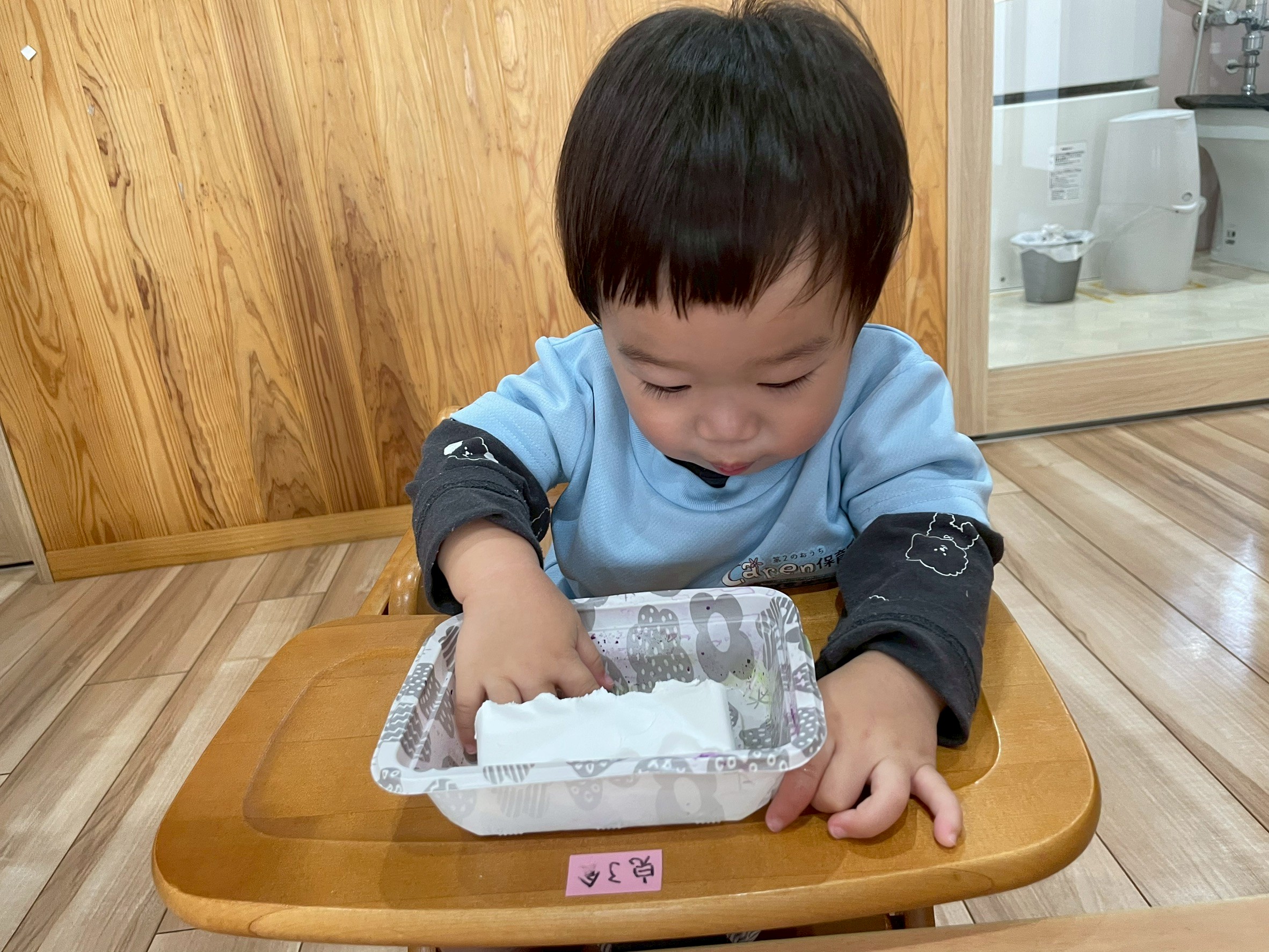 真っ白な粘土に始めは恐る恐る触っていましたが、ちぎってみたり、指で穴を開けて遊び始めましたよ💕