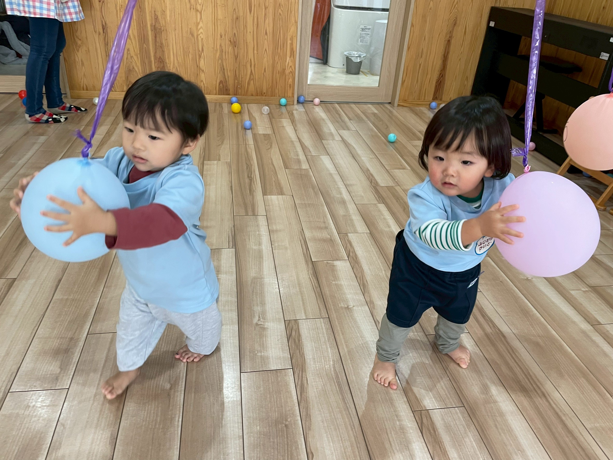 目をキラキラさせて、ぶら下がっている風船を一つひとつ触りながら歩いていましたよ🥰りす組🐿️