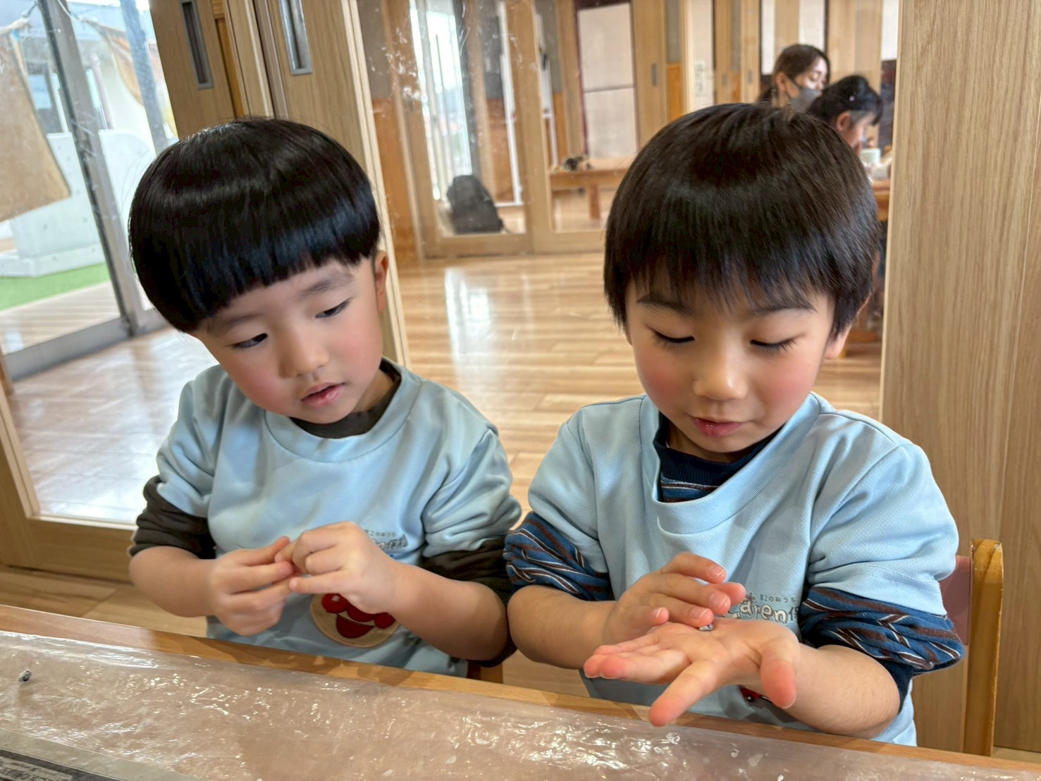 製作後は少しだけ園庭に行って遊びました。寒さなんかへっちゃらなお友達、『狼さんごっこ🐺』をしてたくさん逃げて体を動かしたり、砂場で大きな山をみんなで作って登ったり滑ったりしながら思いっきり楽しんでいたお友達でした😀うさぎこあらきりん🐰🐨🦒