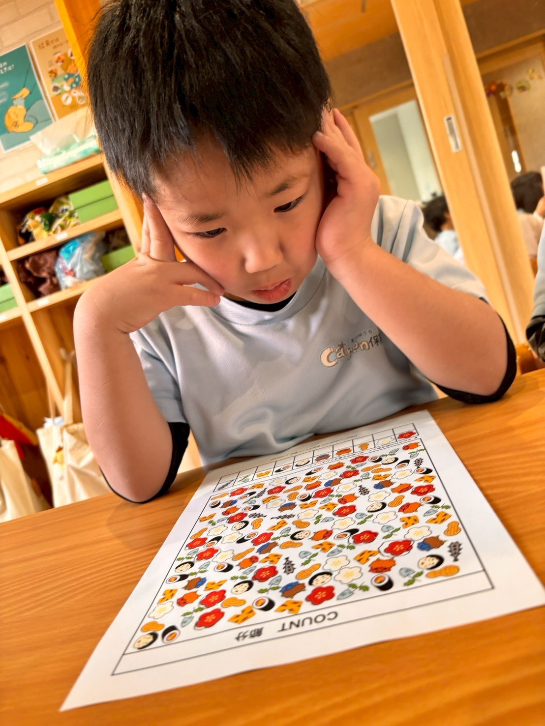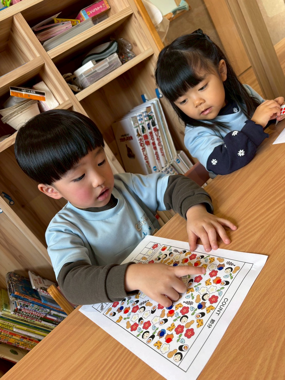 待っているクラスはプリント学習で、たくさんの絵の中から同じ絵を数えて個数を書きました✏️うさぎ組は数を書く代わりにシールを貼りました🔴🔵こあらきりん組は丸をつけながら数を出すことができました○頑張った分、答え合わせをして当たるといつも以上に「やったー!✨」と喜んでいました🤭💕