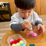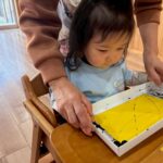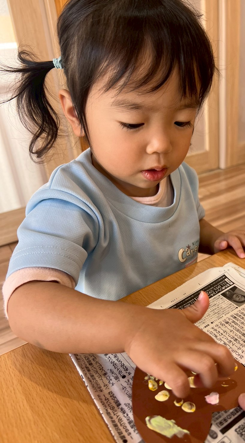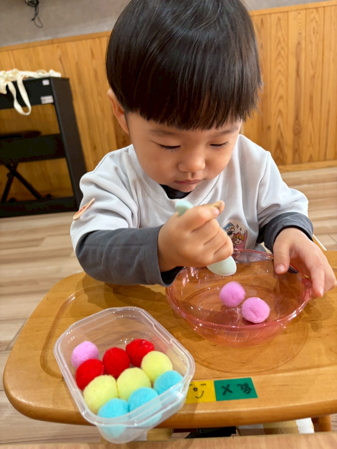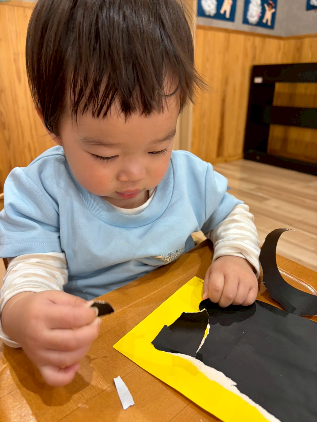 黄色い画用紙に黒い色紙を貼り、ビリビリと剥がしてトラ柄🐯になるはずでしたが…みんなキレイに剥がしていて、黄色いパンツになってしまいました😄指先でつまむのが上手になってとっても嬉しい成長です❣️トラ柄にならなかったので、急遽、黒い絵の具でビー玉を転がして模様をつけましたよ😆とってもカッコいいパンツになりました💕待っているお友だちはぽっとん落としやスプーンでフェルトボールをすくって別の容器に移して遊び、スプーンに乗せて落とさないように真剣な表情で取り組んでいました😍