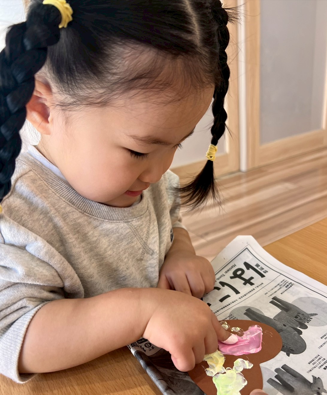 こあら組さんはポピードリルで名前書きを頑張り、きりん組さんは2月の製作を終え、3月に使う手形を取りました🎨