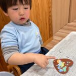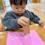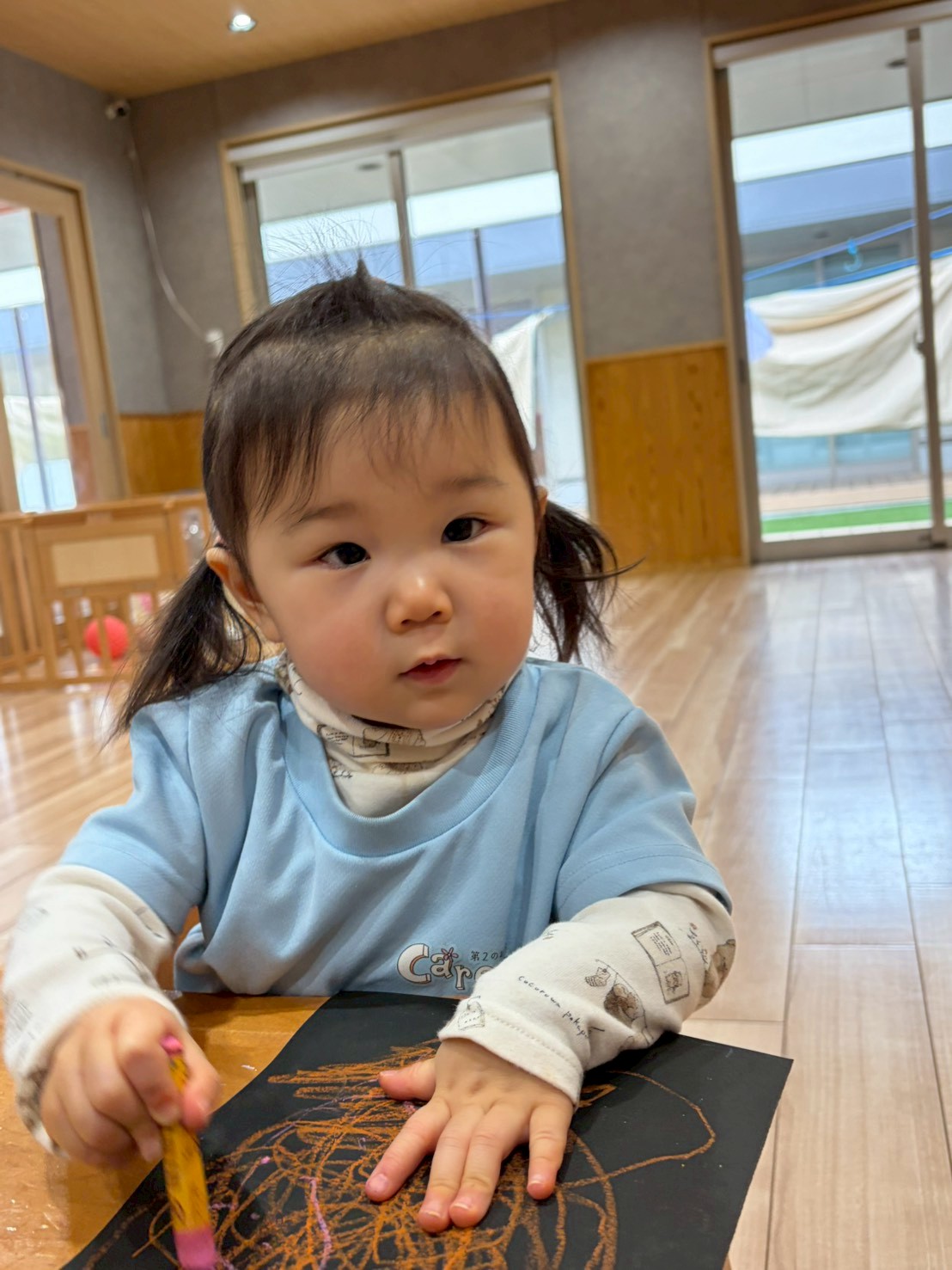 スタンプの順番を待ってるお友だちは、黒の画用紙にクレヨンでなぐり描きをしました🖍️いつも白い画用紙に描く事が多いのですが、黒い画用紙ではクレヨンの色がいつもと違って見えて、グリグリと力を入れて描いているお友だちもいましたよ😊
