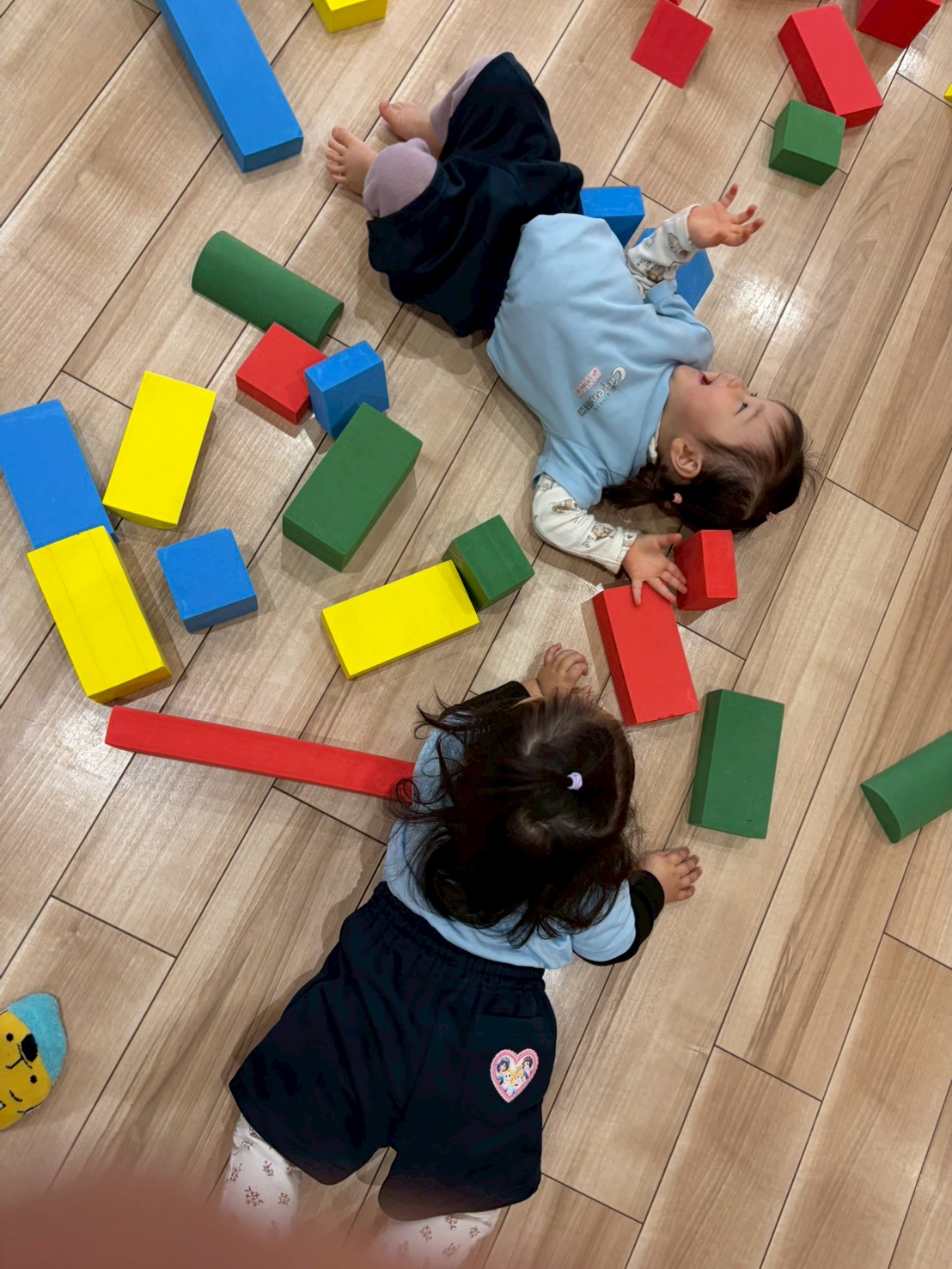 その後は、お部屋の中でウレタンの積み木で遊びました❣️高く積み上げて崩したり、積み木に座って乗り物に見立てて遊んだりして楽しみました🥰りす