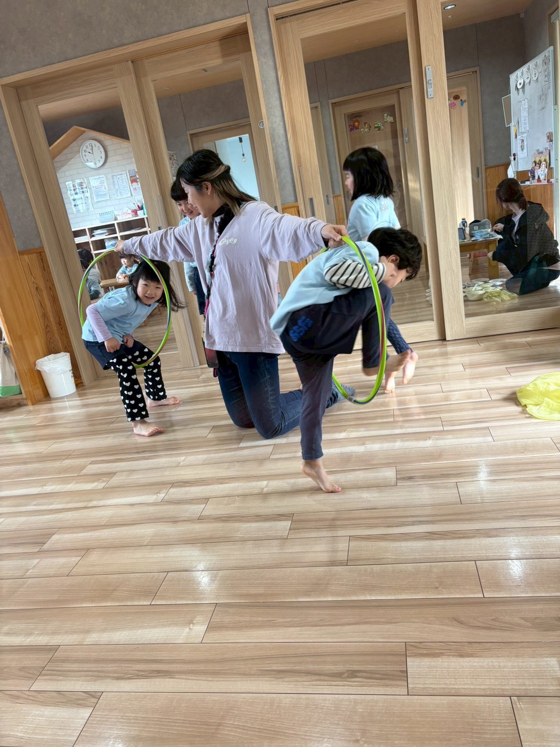 フープやスカーフを使ってリズム遊びを楽しみました!音楽に合わせて揺らしたり、くしゃくしゃ丸めたり、動物になりきったりと元気いっぱい!ピアノの音をよく聞いて、すぐに反応できるお友だちもいましたよ✨