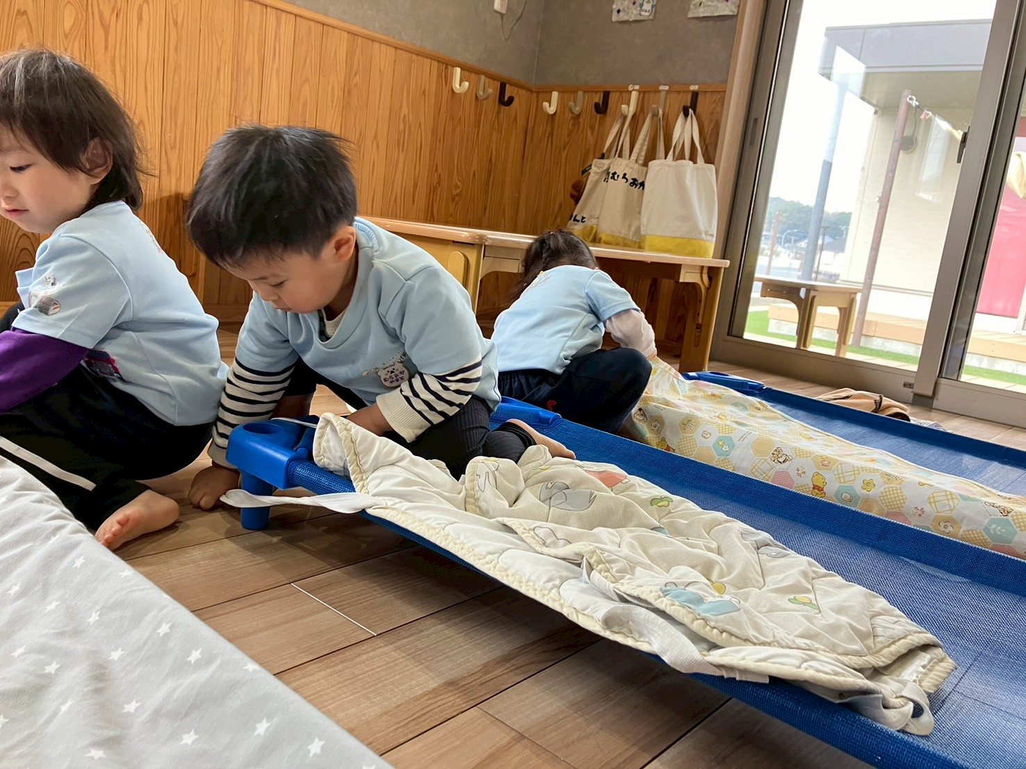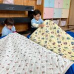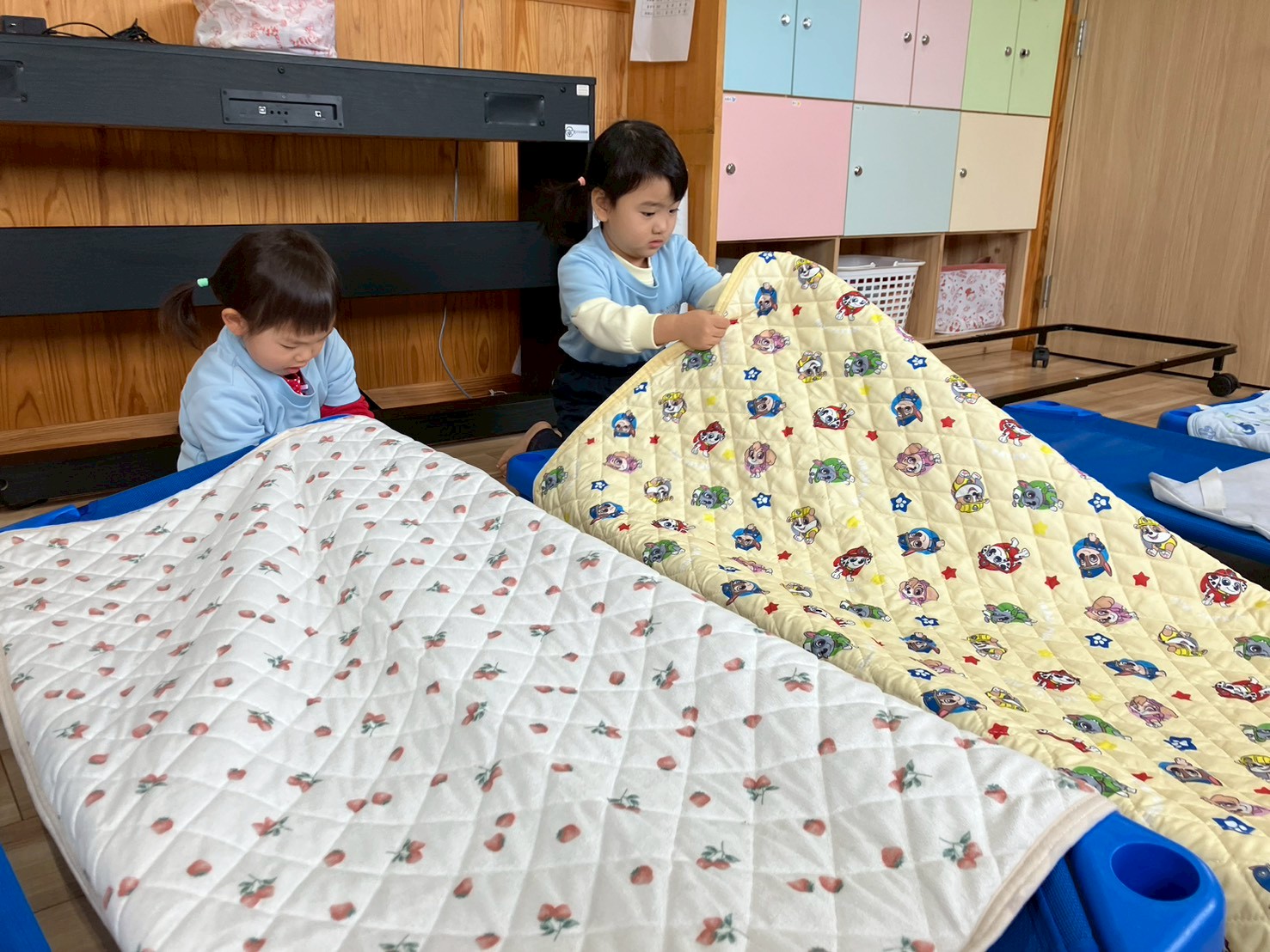 ベッドを持ち上げてゴムをかけるのが難しそうでしたが、保育者と一緒に頑張りましたよ🛏️✨
