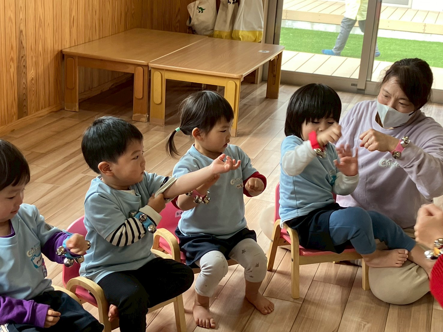 リトミックでは鈴を付けて踊ったり、大判スカーフでかくれんぼをして喜ぶ子ども達でした🥰