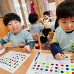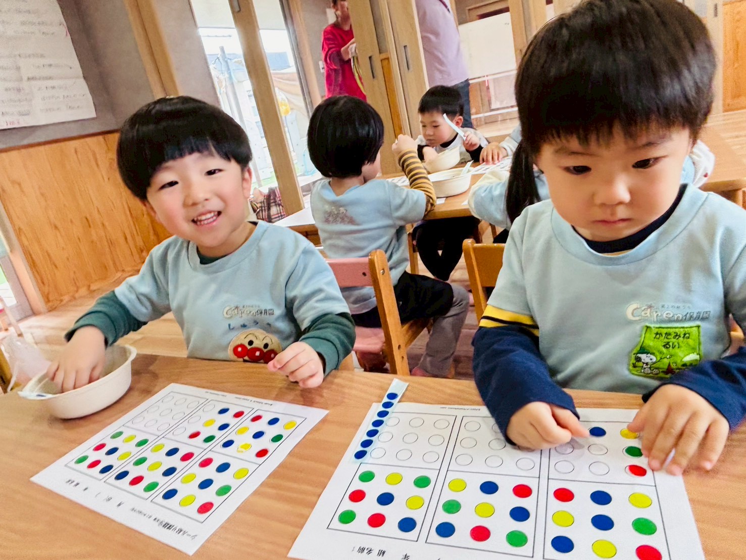 うさぎ組は手を叩いてリズム打ちに挑戦し、音に合わせて楽しく体を動かしました🥰こあら組はフープを使い、跳びながらリズム打ちをし、身体全体を使いながらリズムを感じ、いきいきと取り組んでいましたよ✨また、見本を見ながら同じ色・同じ場所にシールを貼る活動にも取り組みました指で一つひとつ確認しながら進める姿が見られ、集中して取り組むことができていましたよ♡
