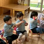 その後はお楽しみのリトミック🎵曲に合わせてスカーフを振ったり、顔に被せて「いないいないばぁ!」としたり、ピアノに合わせて椅子に座ったまま動物や汽車になって楽しみましたよ😄