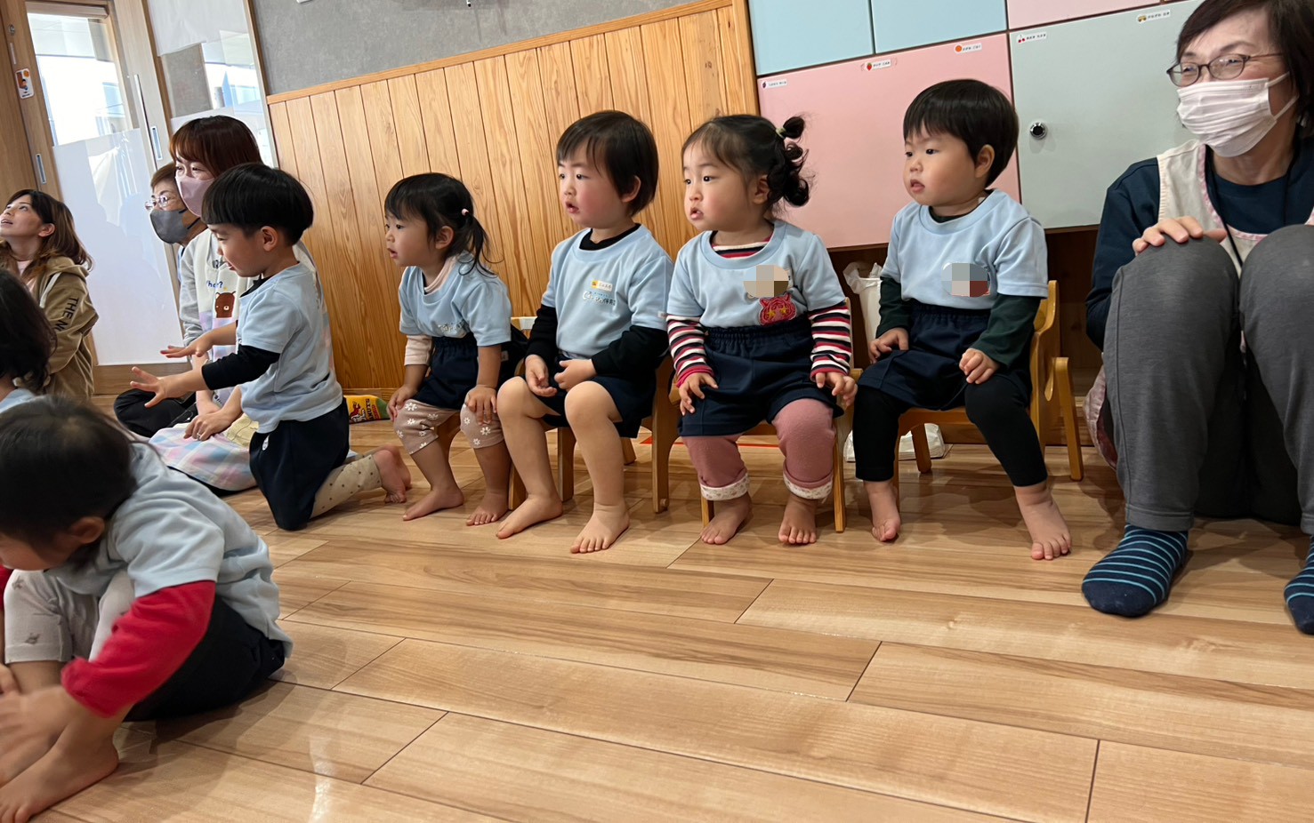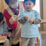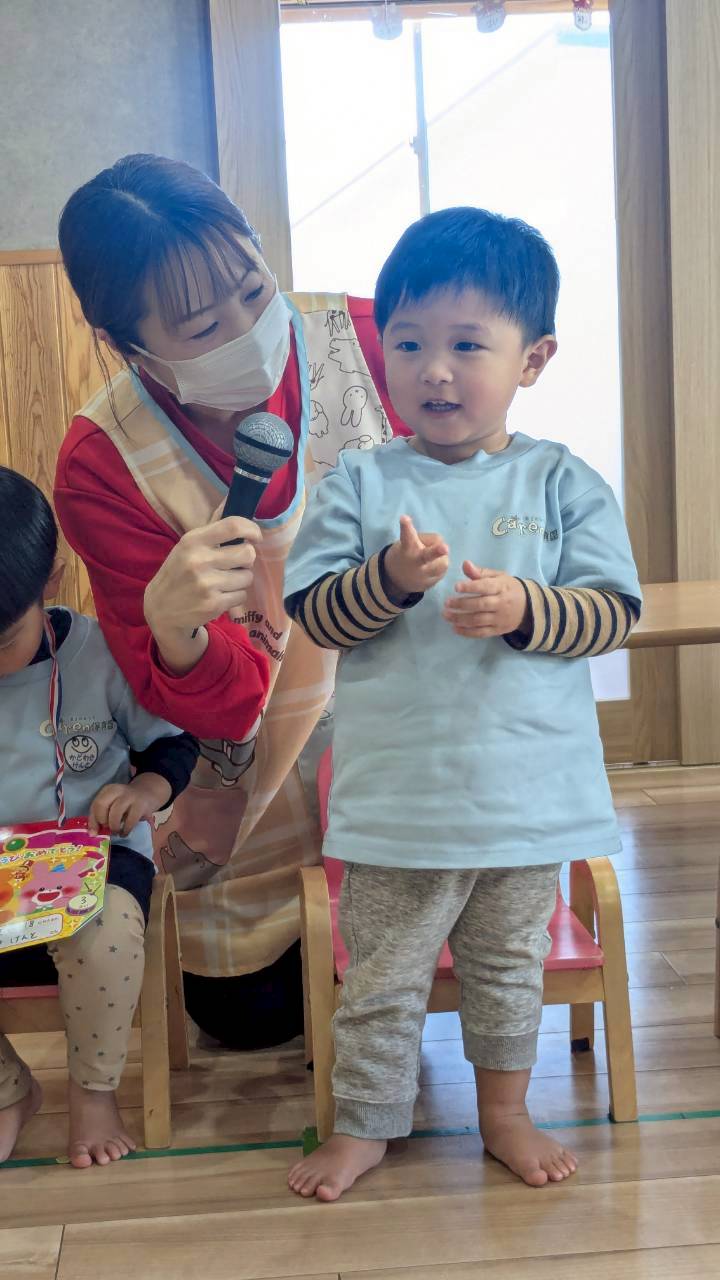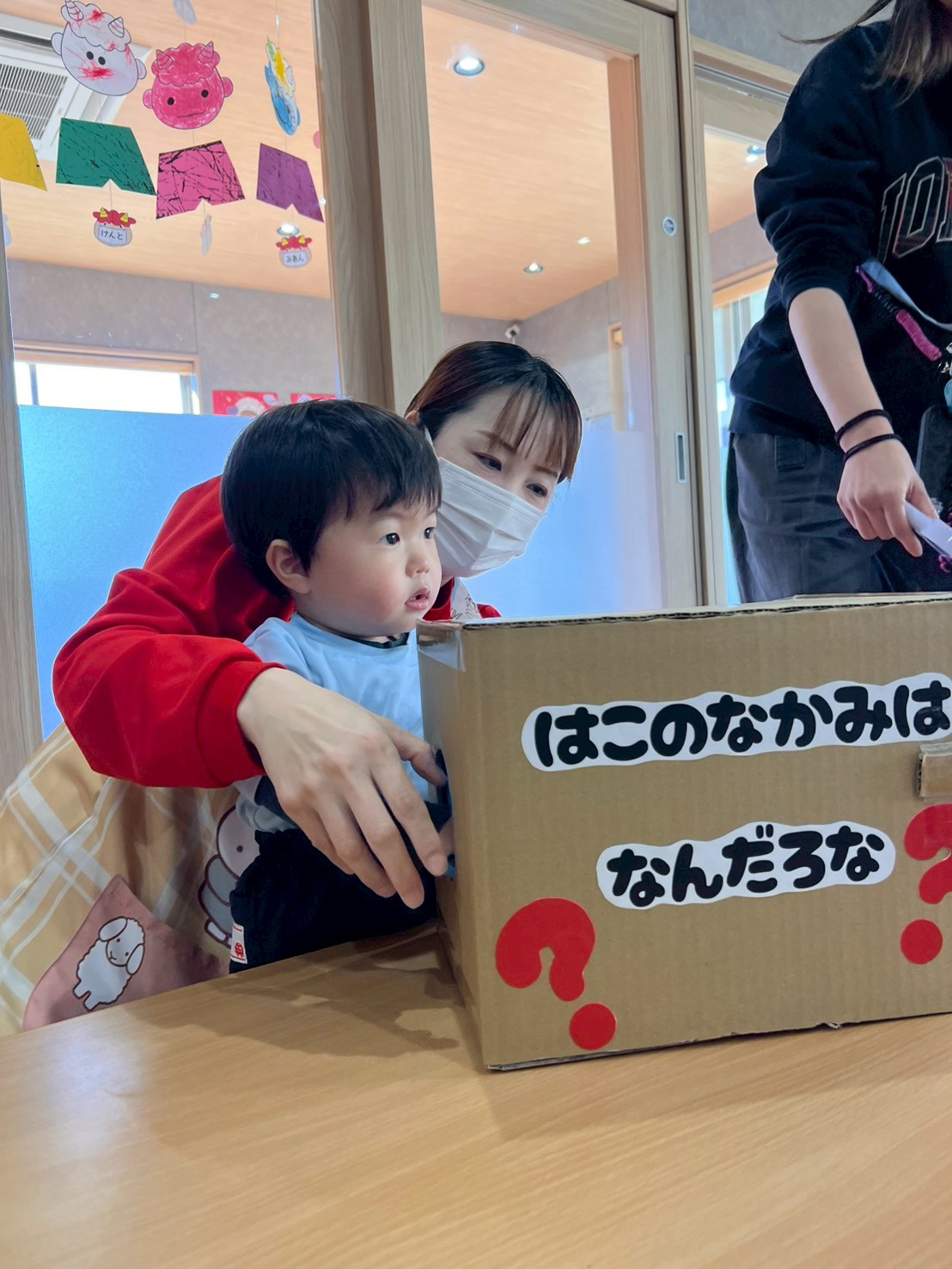 とても温かい雰囲気の中でお祝いすることができましたよ!その後は先生の出し物「箱の中身はなんだろな?」🎁✨いろいろな音や声を聞きながら、「あ!」「あんぱんち!」と声を出して当てようとする姿が見られ、楽しそうに参加していました♪