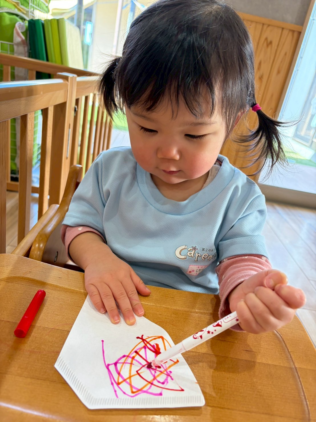 その後はお雛飾りの製作をしました🎎一人ずつ水性ペンで模様を描きました。点々や線、○丸が描けるようになっていましたよ❣️色とりどりのかわいいお雛様になりそうです🎎