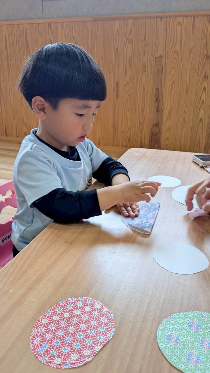 今日は昨日したひな祭り🎎製作の続きで和柄の折り紙で着物👘をおりました。好きな柄の折り紙を選び『これはお内裏様、こっちはお姫様(お雛様)』と色々な和柄選びに迷っていたお友達でした。折り紙も半分こ、こんにちわ、と上手におることができましたよ👏