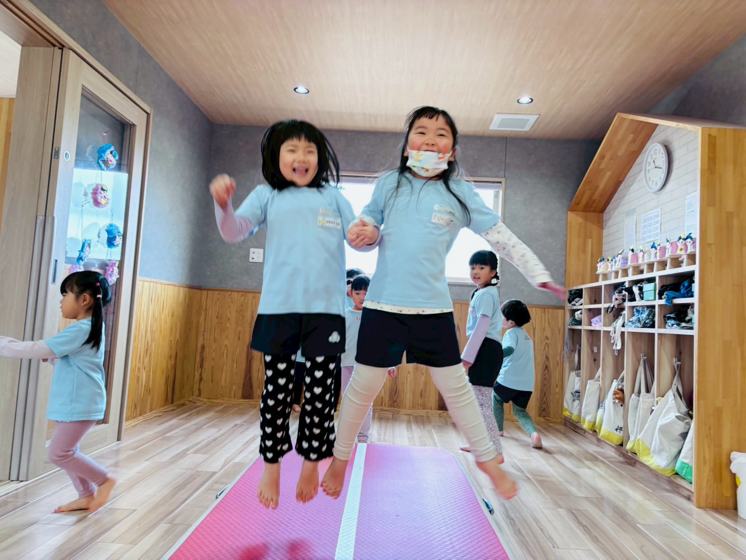 そのあと室内でこあら組とグループに分かれてじゃんけんゲームをしたり、遠足から帰ってきたうさぎ組も一緒にトランポリン、跳び箱、ラダーを自由に遊びました😆💗