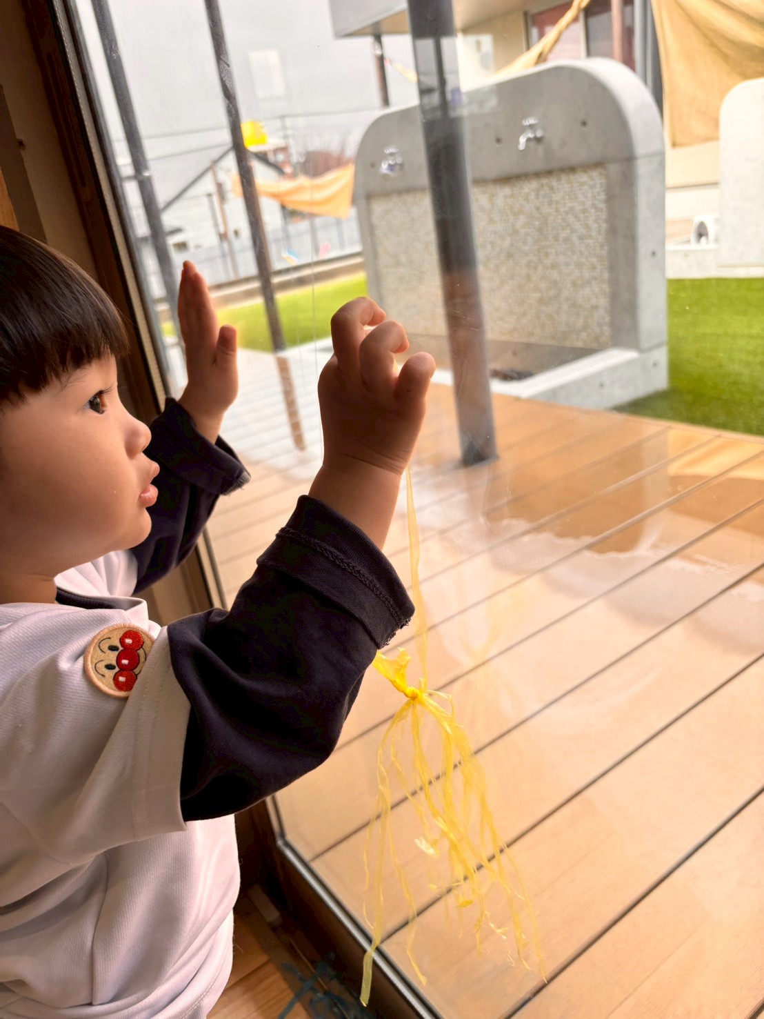 スズランテープを指先で小さくさいて、静電気で窓や風船にくっつけてみました!