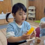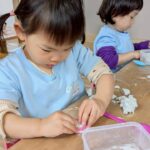 製作をしながら今日は粘土遊びをしました。粘土べらやローラーも一個ずつしかなかったので今日は時間を決めて使うお約束をしました。みんな5分ずつ時間を守り『はいどうぞ』と順番に使うことができました👏。