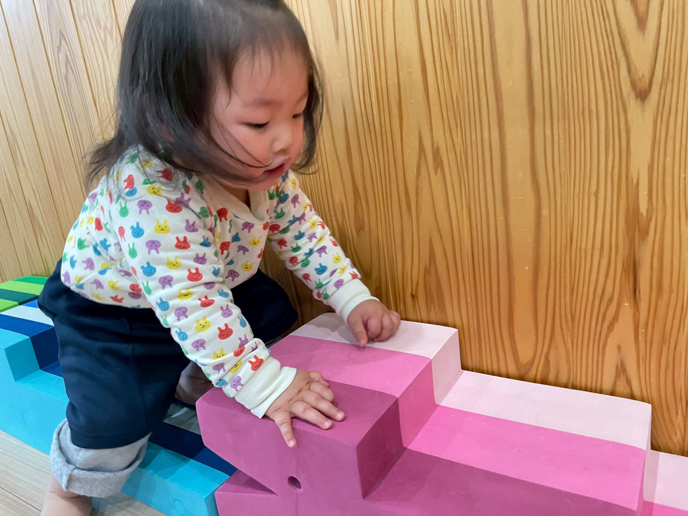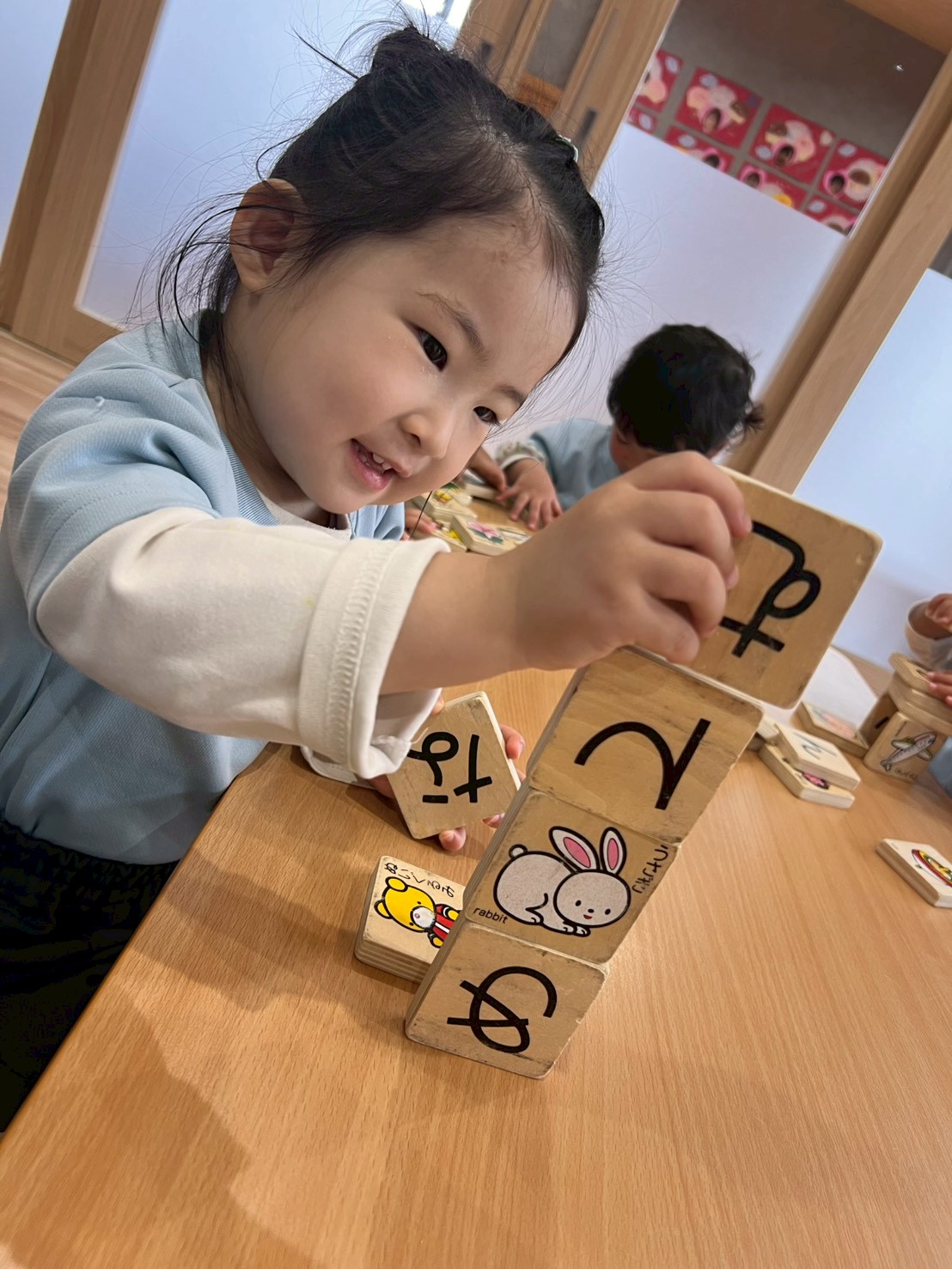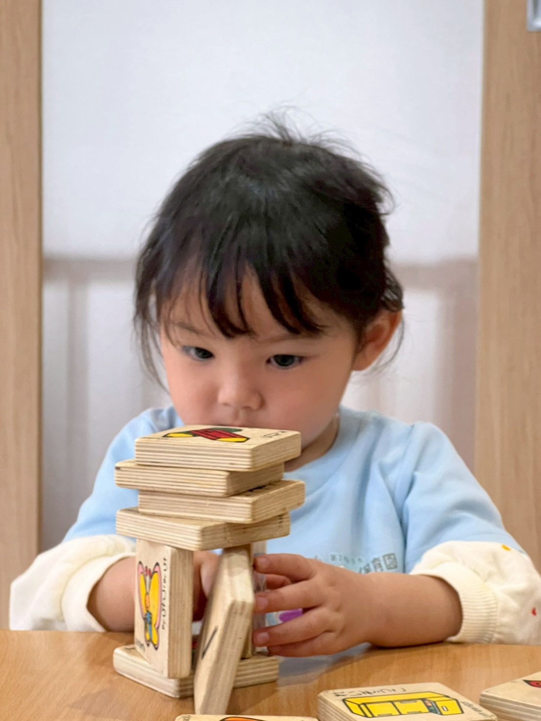 まずは自由に積み上げたり並べたり♪その後は高く積み上げるゲームに挑戦!順番を守り、そーっとゆっくり乗せることを意識しながら行いました😊途中で斜めになって倒れてしまいましたが、今度はその数を使ってかるた遊び!数回目ということもあり、ルールを理解している子が多く、前のめりになりながら楽しんでいました😆