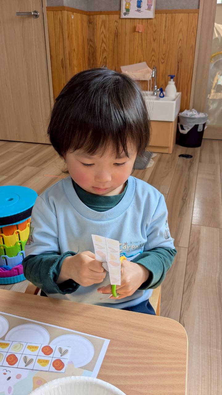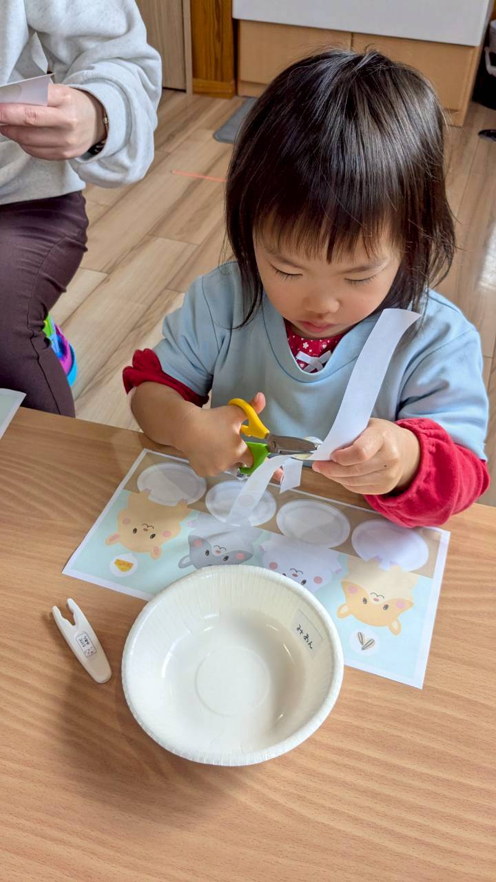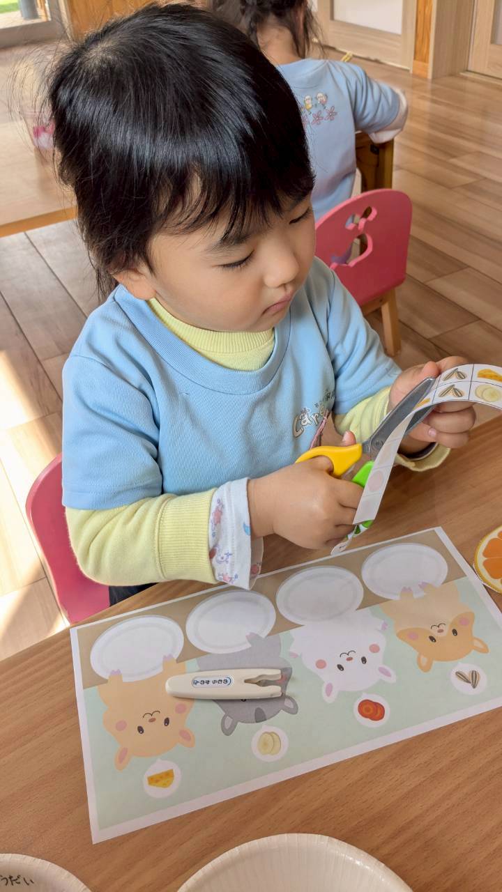 はさみではハムスターのエサを一発切りで切る活動に喜び、全部切るとハムスターのお皿にエサを配って楽しんでいましたよ🥰
