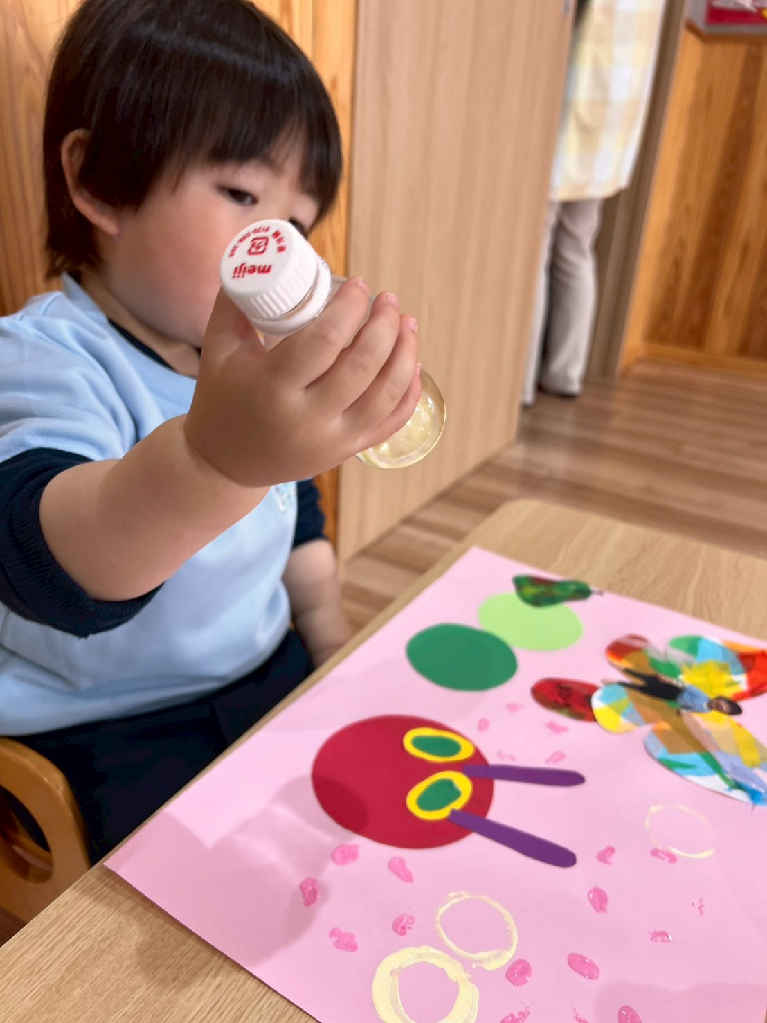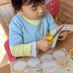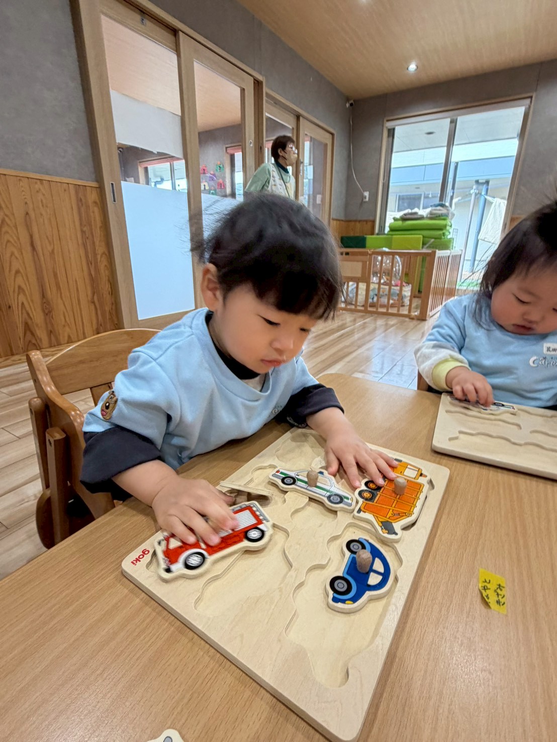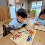 手型のお友だちは赤い絵の具を手のひらに塗ってペッタン🫲その手で白い画用紙にもペタペタと色をつけていきました😄いつもは1度だけのペッタンですが、画用紙に自由にペタペタできて楽しそうでした❣️他のお友だちは木製の形はめパズルをしましたよ😊乗り物や動物など、形を覚えたのか、ポンポンとはめていける子やパズルの絵の名前を言えるお友だちもいました💓