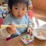 お箸ではスポンジを摘んで容器に移し替える遊びを行い、保育者の補助なしでも出来ているお友達が増えてきました👏