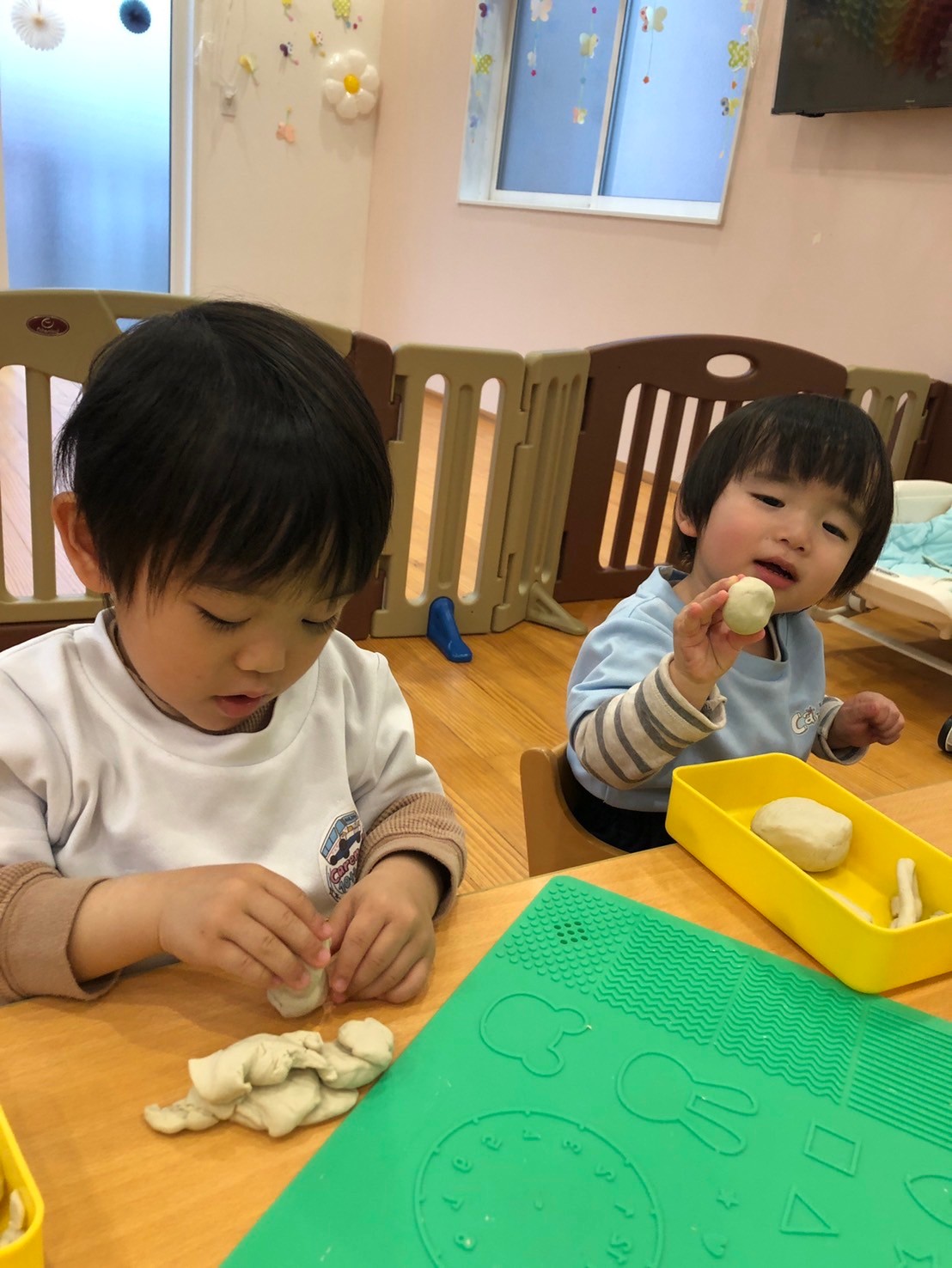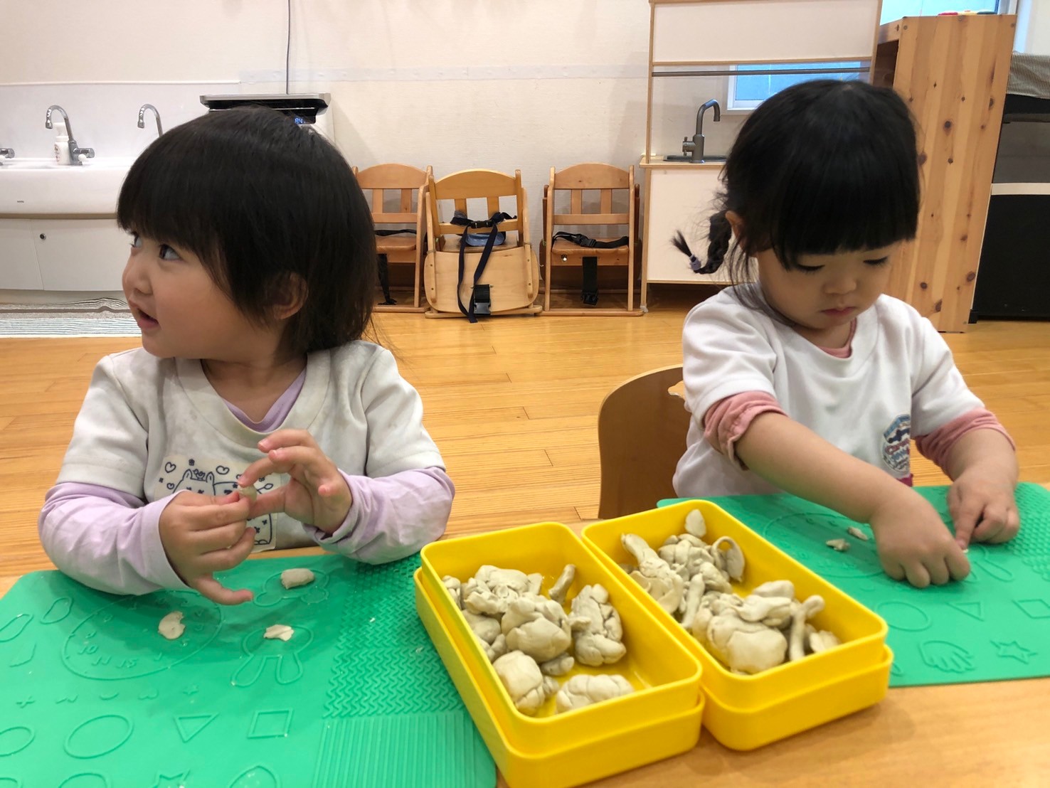 丸めたり、こねたりして感触を楽しみながら遊んでいましたよ!