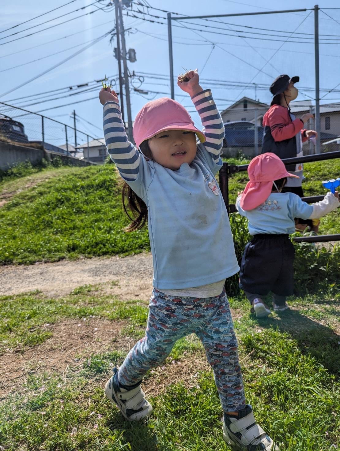 元気に走り回ったり、階段を駆け上がって楽しんでいましたよ😊公園で遊んでいると、カラフルにラッピングされた電車🚃が通り、みんなで手を振ってバイバーイ🤗しましたよ☺️