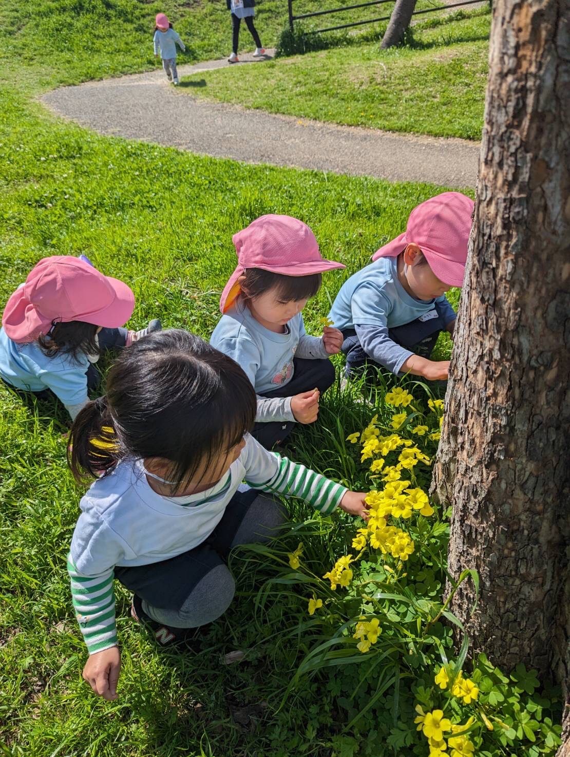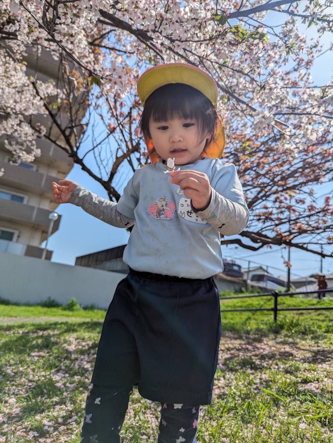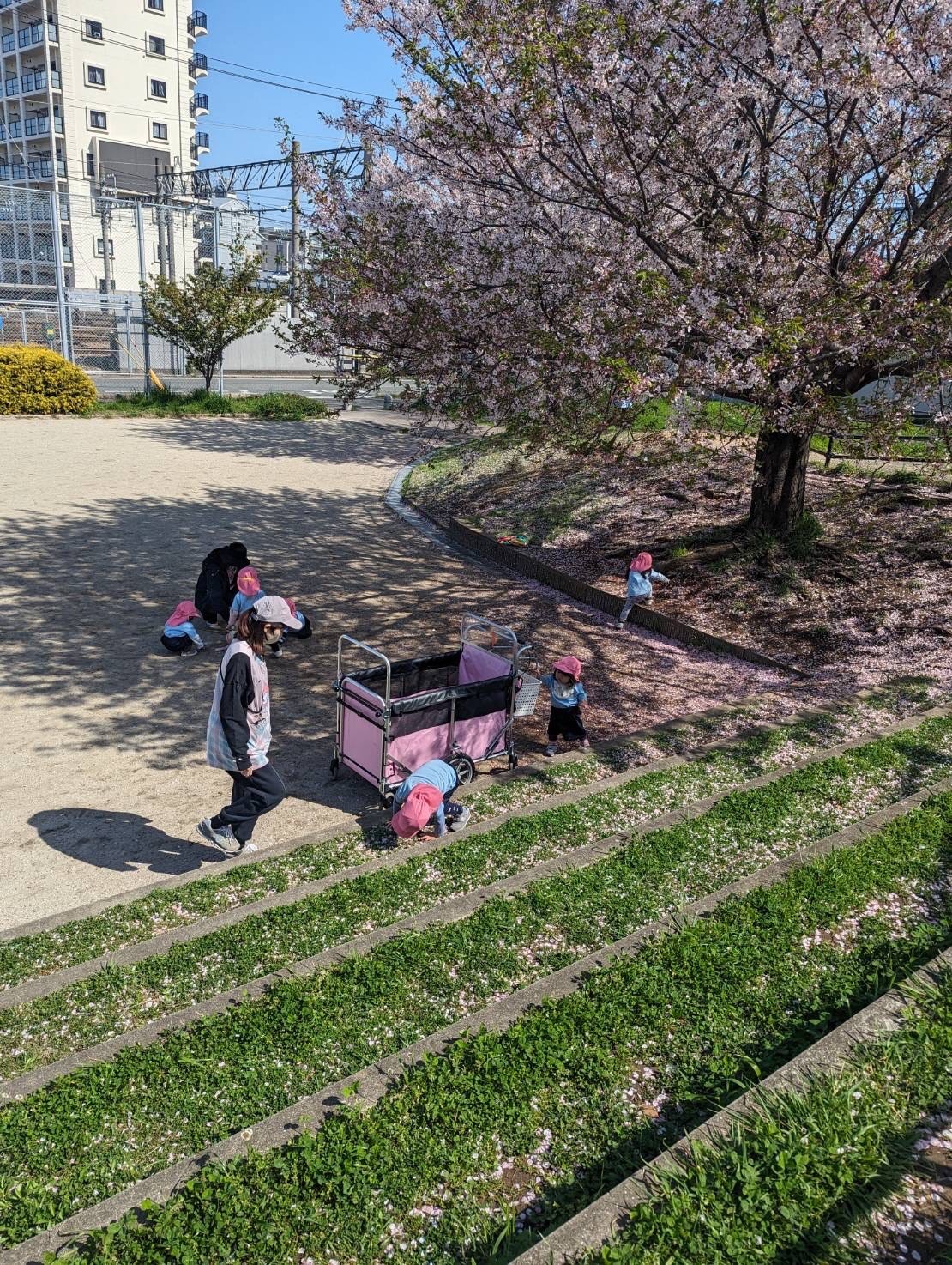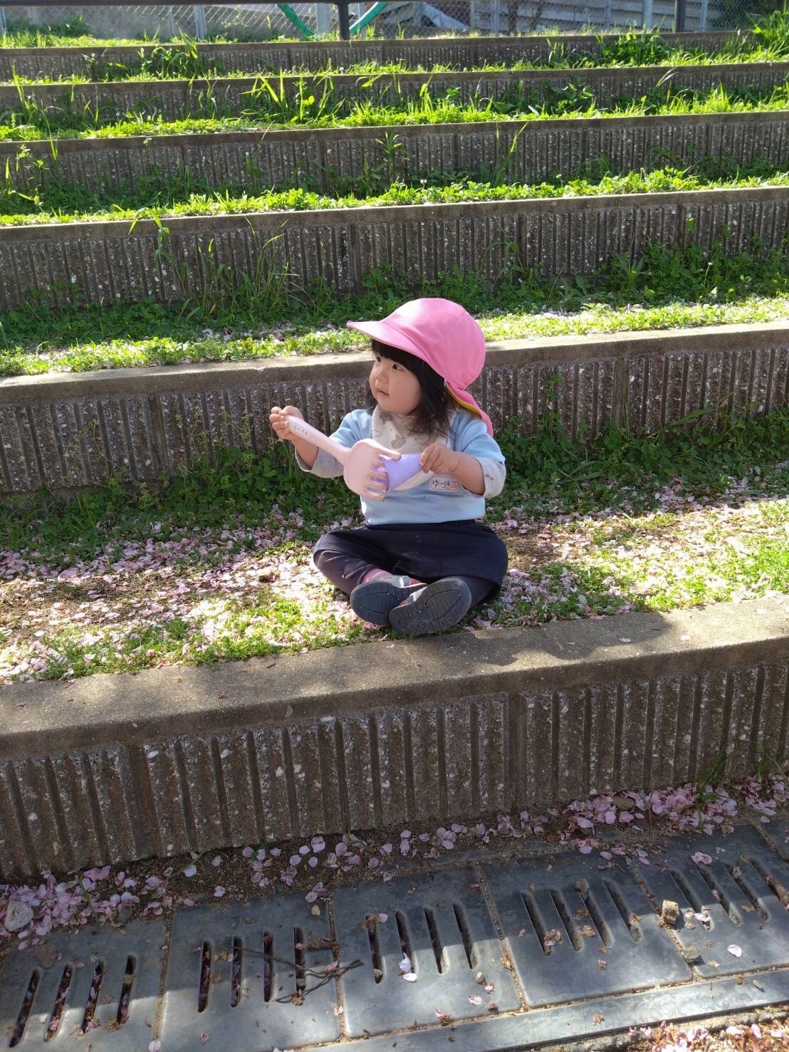 桜が残る公園で、花びらを集めたり、アリを見つけて大喜びの子どもたち💕