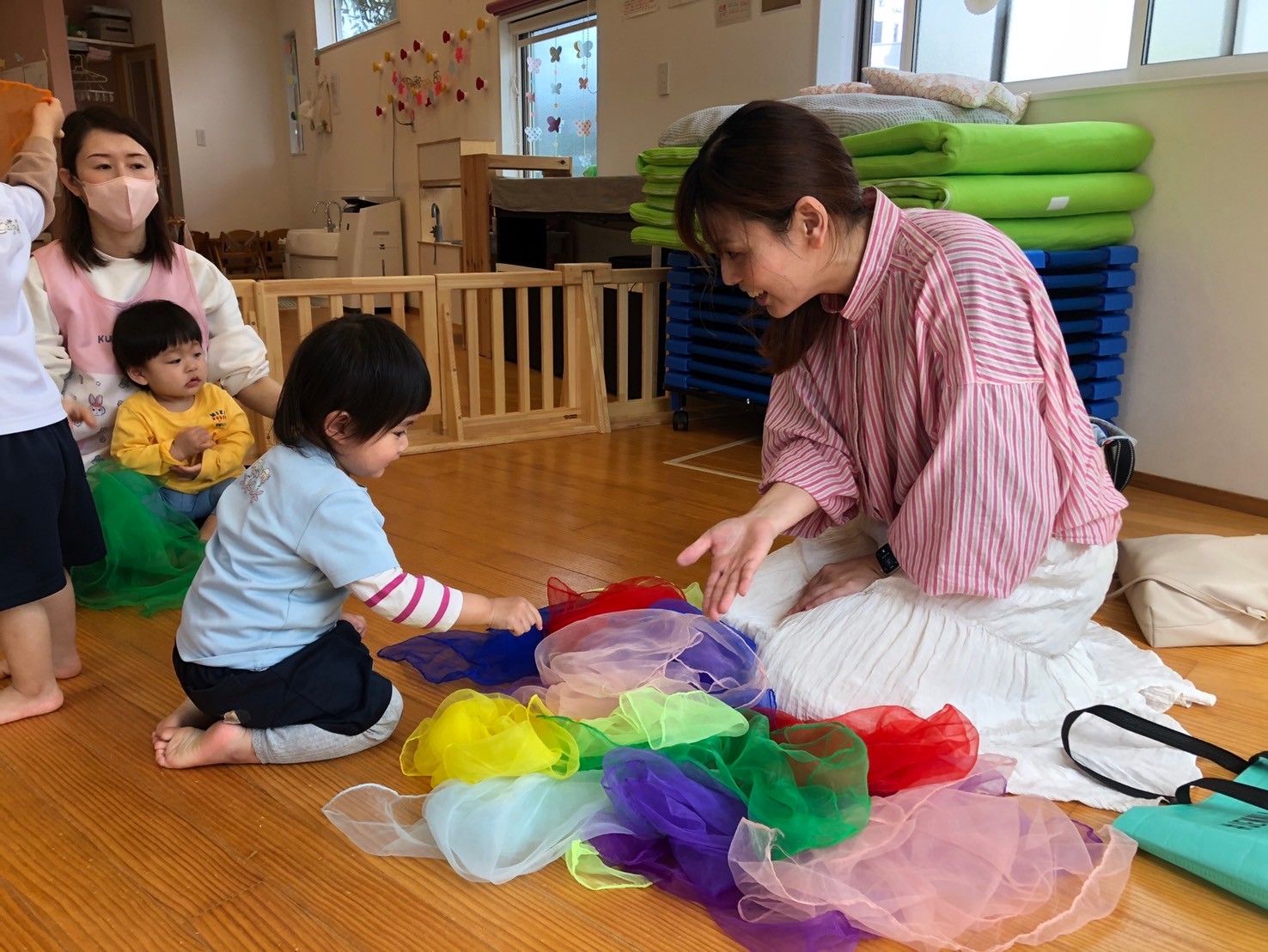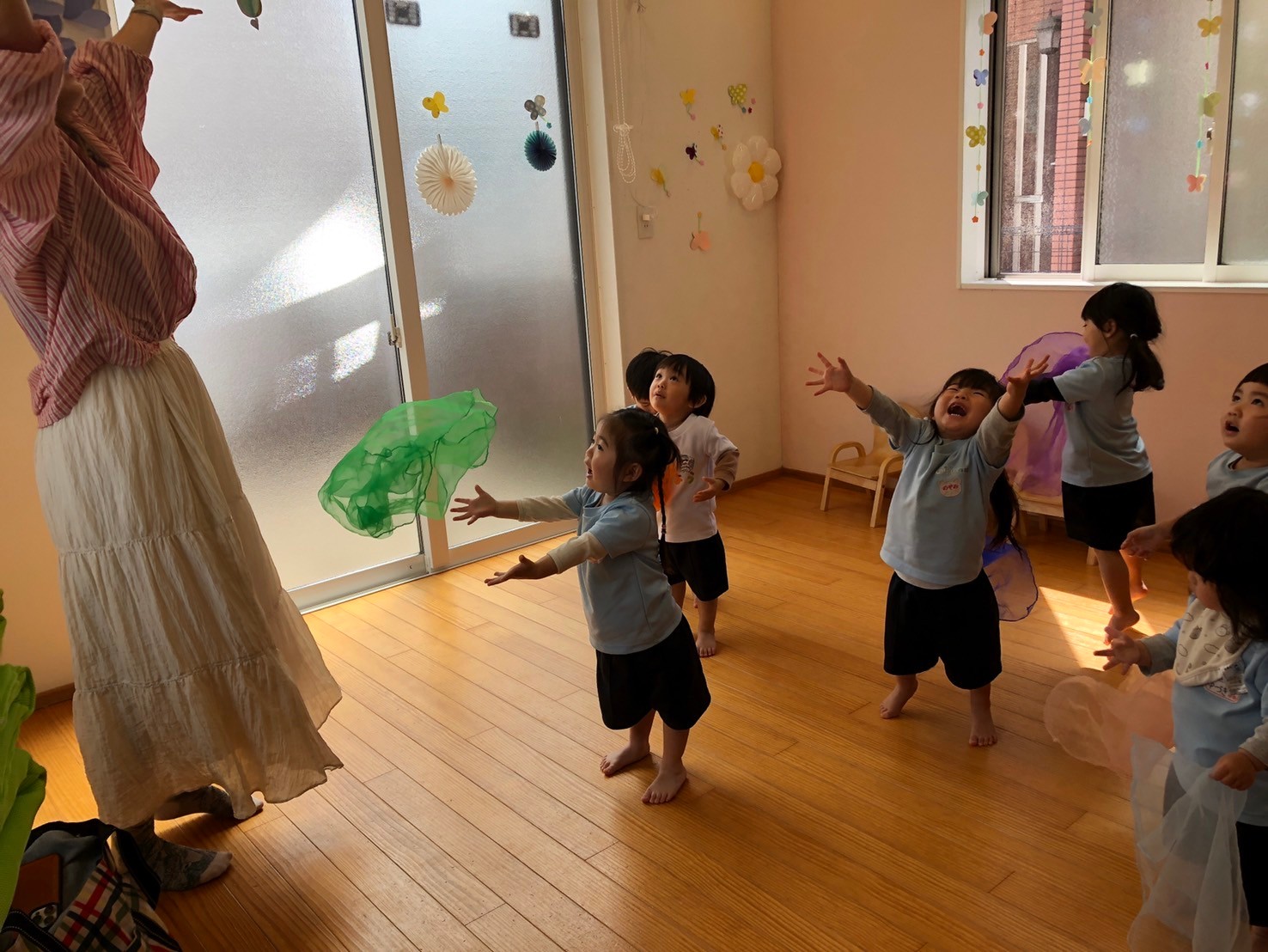 舞上げたシフォンがふわふわ…とゆっくり落ちてくると「きゃー♡」と大喜びな子ども達でした✨