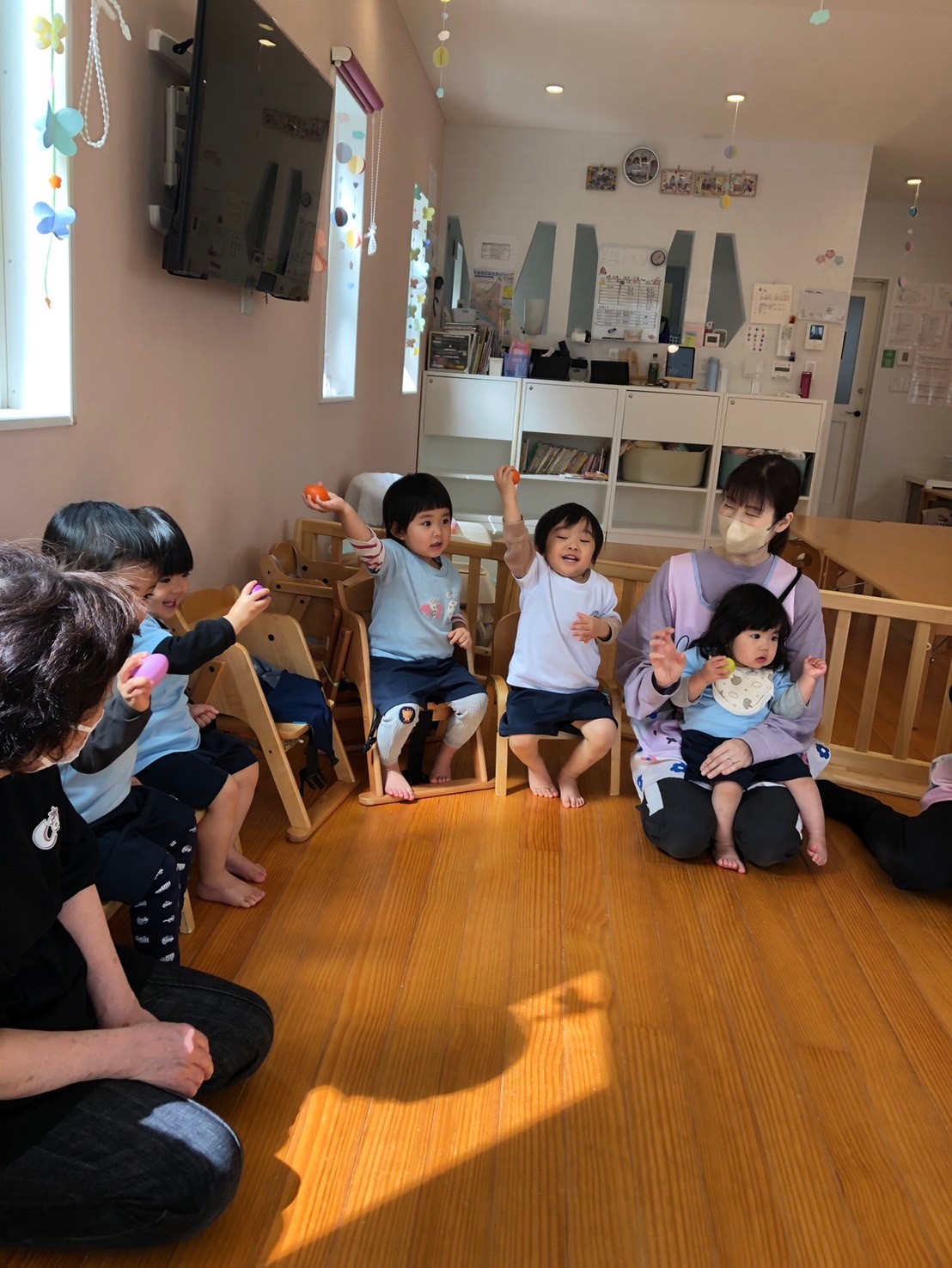 たまごの形のマラカスを1つずつ手に持ち「あたまかたひざポン」の音楽に合わせて楽しみました♪